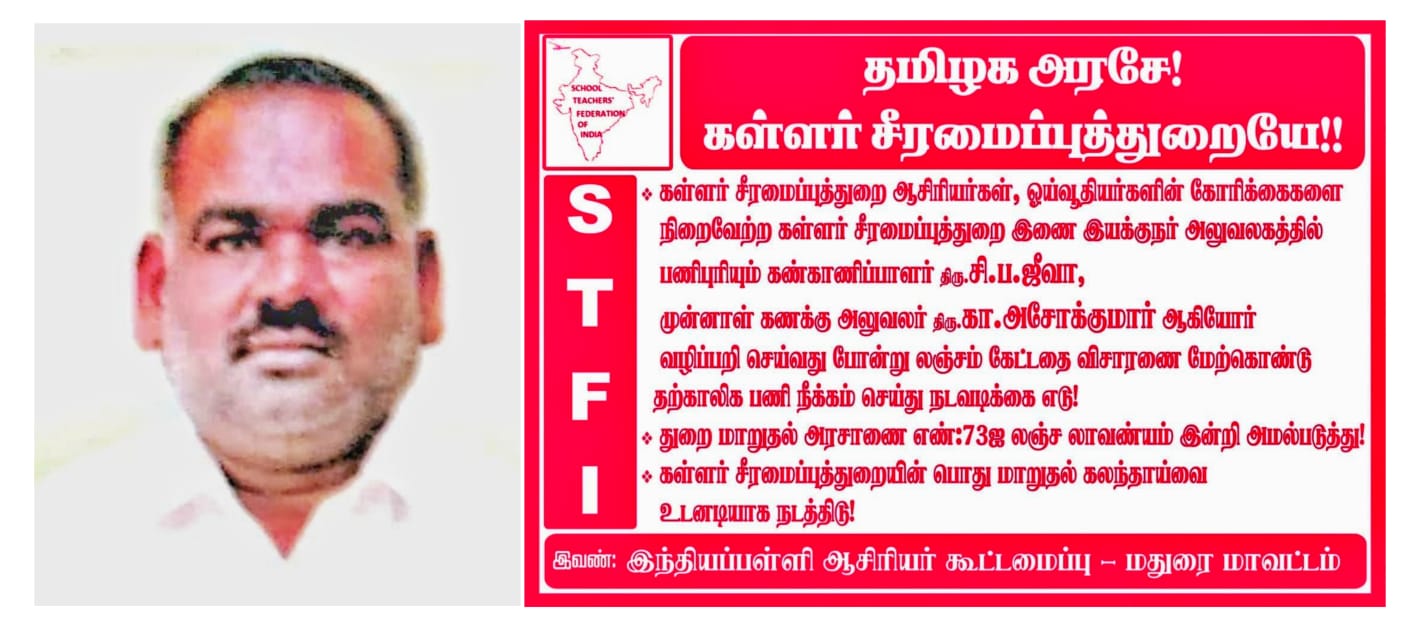 கள்ளர் சீரமைப்புத்துறை ஆசிரியர்கள் மற்றும் ஓய்வூதிர்கள் தங்களது நியாயமான கோரிக்கைகளை நிறைவேற்ற வலியுறுத்தி விண்ணப்பிக்கும் நிகழ்வில் கள்ளர் சீரமைப்பு இணை இயக்குநர் அலுவலகத்தில் பணிபுரியும் அலுவலக கண்காணிப்பாளர் ஜீவா மற்றும் முன்னாள் கணக்கு அலுவலர் அசோக் குமார் ஆகியோர் சம்பந்தப்பட்ட ஆசிரியர்களிடமும் மற்றும் ஓய்வூதியர்களிடமும் அலைபேசியிலும், அலுவலகத்திற்கு வரவழைத்து நேரிலும் வழிப்பறி செய்வது போன்று கையூட்டு கேட்டதை துறை ரீதியாக விசாரணை மேற்கொண்டு சம்பந்தப்பட்டவர்கள் மீது உரிய நடவடிக்கை எடுக்க வேண்டும். உரிய முறையில் விசாரணை நடைபெறும் போது விசாரணையில் ஆவணங்களை முன்னிலைப்படுத்த இந்தியப்பள்ளி ஆசிரியர் கூட்டமைப்பு தயாராக உள்ளது.