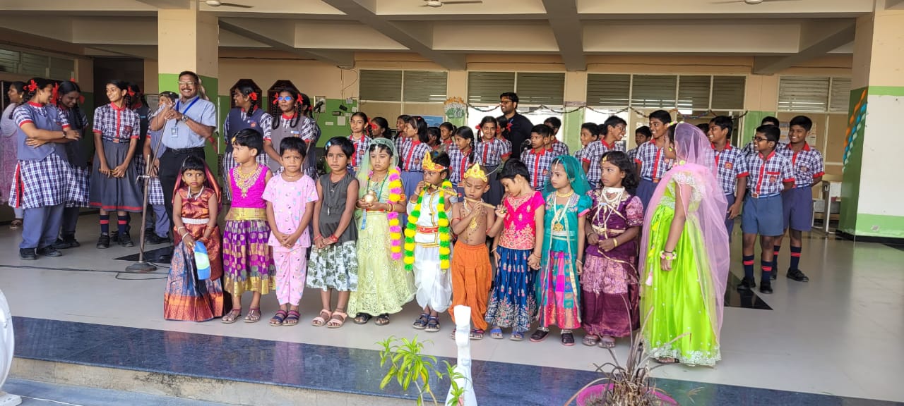 கேந்திரியா வித்யாலயா பள்ளியில் கிருஷ்ண ஜெயந்தி விழாவில் கிருஷ்ணர் ராதை வேடமடைந்து வந்த பாரம்பரிய உடையில் மாணவ மாணவிகள்