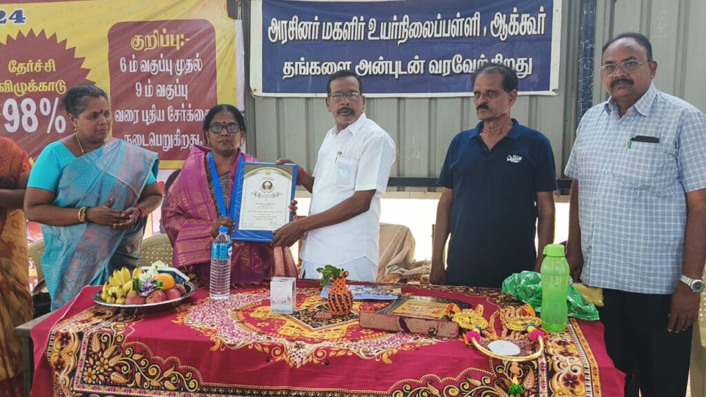 வழியெங்கும் மாணவிகள் டிரம்ஸ் இசை ஒலிக்க உற்சாக நடனத்துடன் தங்கள் தலைமை ஆசிரியையை பள்ளிக்கு அழைத்து வந்து கரகோஷம் எழுப்பி தங்கள் மகிழ்ச்சியை வெளிப்படுத்தினர். தொடர்ந்து நடைபெற்ற பாராட்டு விழாவில் ஆக்கூர் ஊராட்சி மன்ற தலைவர் ஏ.ஆர் சந்திரமோகன், துணை தலைவர் ஜெ.சிங்காரவேலு,ஊராட்சி மன்ற. உறுப்பினர்கள், தனியார் பள்ளி முதல்வர்கள் மற்றும் அப்பகுதி பொதுமக்கள் விருது பெற்ற தலைமை ஆசிரியைக்கு பொன்னாடை அணிவித்து வாழ்த்துக்களை தெரிவித்தனர்.