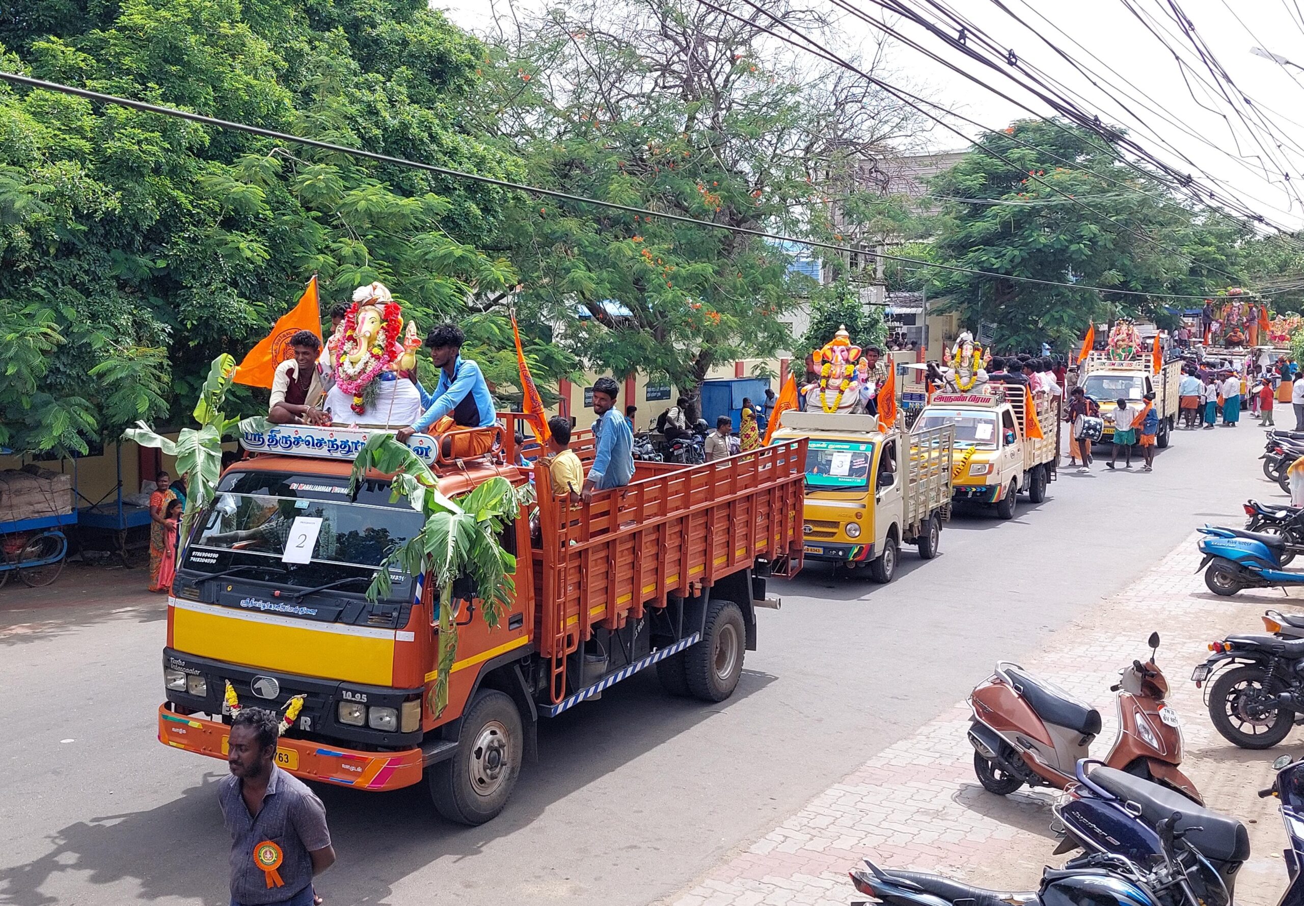 விநாயகர் சதுர்த்தியை முன்னிட்டு நகர மற்றும் ஒன்றிய பகுதிகளில் பல்வேறு இடங்களில் மொத்தம் 72 சிலைகள் பிரதிஷ்டை செய்யப்பட்டிருந்தன. இந்நிலையில், விசர்ஜன ஊர்வலத்தையொட்டி, அனைத்து சிலைகளும் தாராபுரம், பொள்ளாச்சி சாலை அமராவதி சிலை அருகே ஒருங்கிணைத்து கொண்டுவரப்பட்டன.