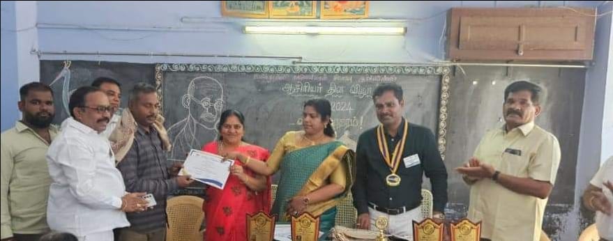 தேனி மாவட்டம் போடிநாயக்கனூர் ரோட்டரி சங்கத்தின் சார்பாக ஆசிரியர் தினத்தை முன்னிட்டு நல்லா சிரியர் விருது பெற்ற ஆசிரியர்களை சிறப்பு விருந்தினராக போடி நகராட்சி நகர் மன்ற தலைவர் ராஜராஜேஸ்வரி சங்கர் பங்கேற்று சால்வை அணிவித்து கேடயங்கள் வழங்கி தங்களின் தன்னலமற்ற சேவை தொடர வேண்டும் என மனதார வாழ்த்தினார் இந்த நிகழ்ச்சியில் ரோட்டரி சங்க நிர்வாகிகள் நல்லாசிரியர் விருது பெற்ற ஆசிரியர்கள் உட்பட பலர் பங்கேற்றனர் நகராட்சி நகர் மன்ற உறுப்பினரும் திமுக தலைமை செயற்குழு உறுப்பினருமான எம் சங்கர் நன்றி கூறினார்