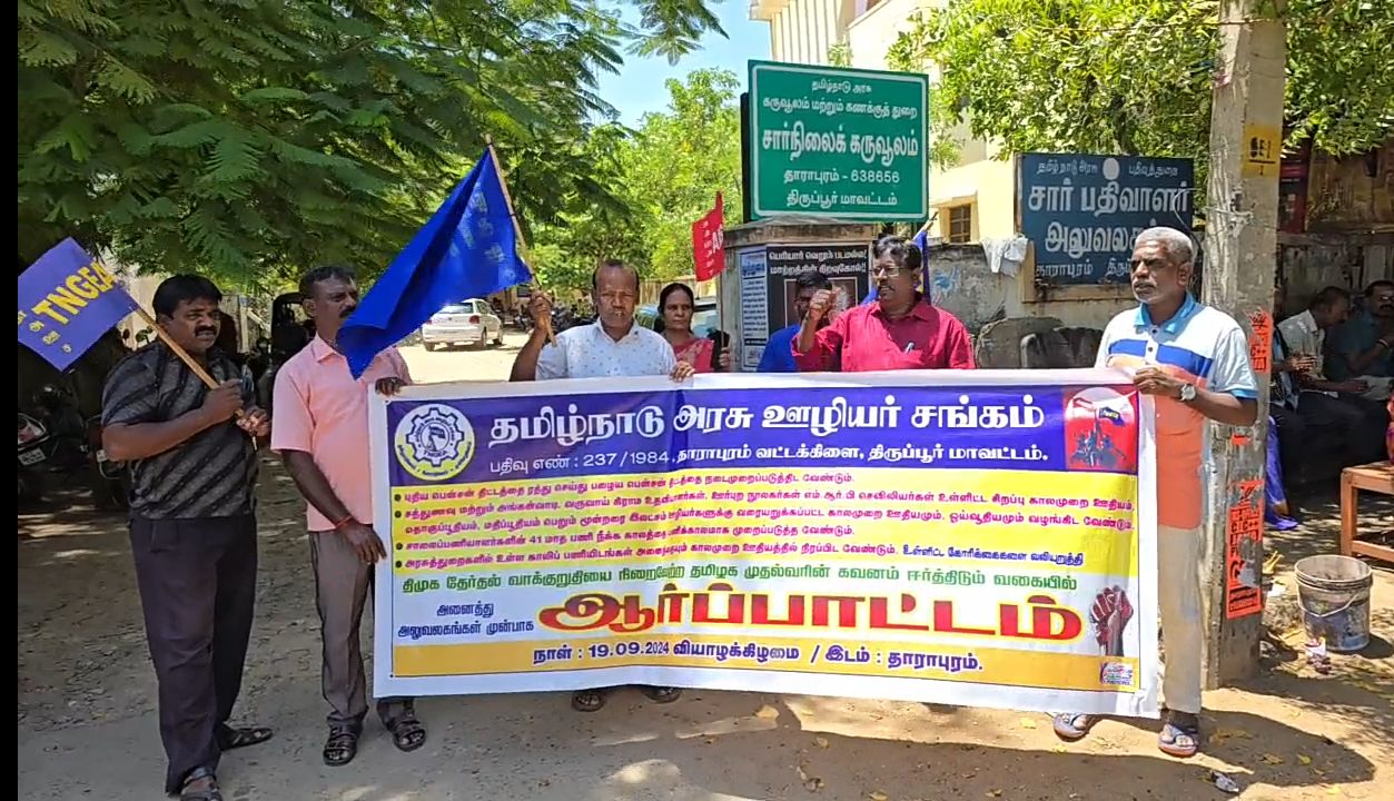 தாராபுரம் வட்டக்கிளை, தலைவர் செந்தில் குமார் தலைமையில் செயலாளர் தில்லையப்பன் முன்னிலையில் அரசு அலுவலகங்கள் முன்பு முதல்வர் கவன ஈர்ப்பு ஆர்ப்பாட்டத்தில் ஈடுபட்டு வருகின்றனர்.