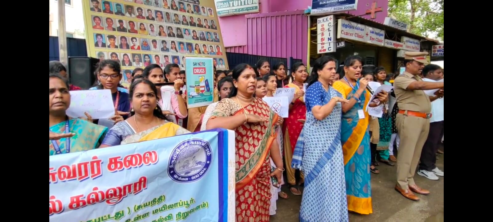 கொளத்தூர் செங்குன்றம் சாலையில் மூகாம்பிகை சாலை சந்திப்பு அருகே அமைந்துள்ள அரசு கபாலீஸ்வரர் கலை மற்றும் அறிவியல் கல்லூரியின் சார்பாக போதை தடுப்பு விழிப்புணர்வு நடத்தப்பட்டது.