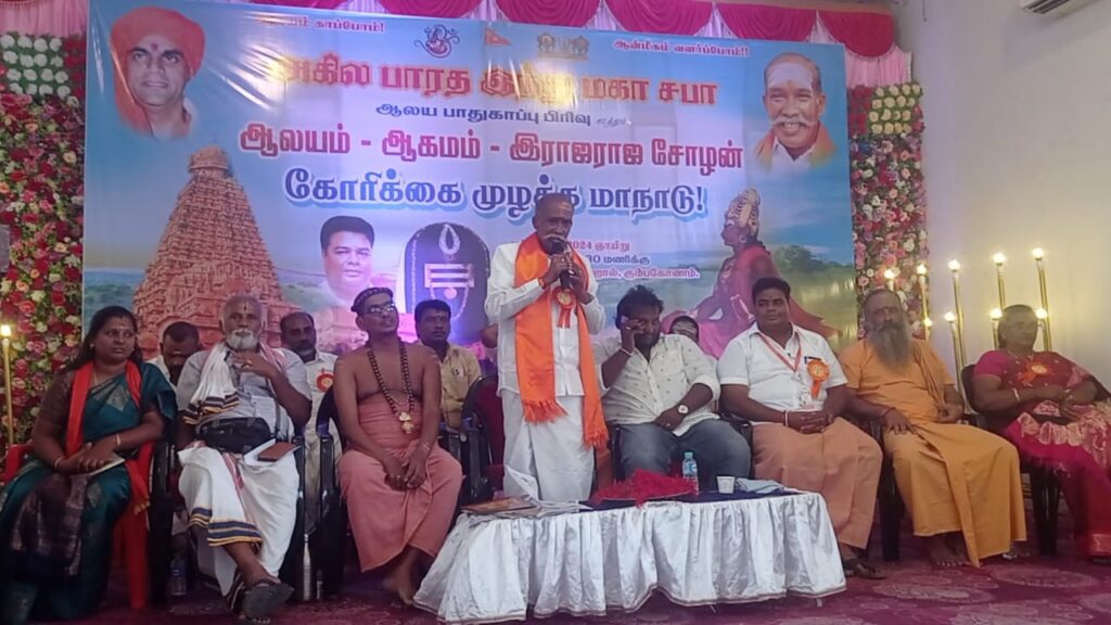 தஞ்சாவூர் மாவட்டம் கும்பகோணத்தில் அகில பாரத இந்து மகா சபா பாதுகாப்பு கோரிக்கை முழக்க மாநாடு இதில் பாரத இந்து மகா சபா ஆலய பாதுகாப்பு பிரிவு மாநிலத் தலைவர் இராம. நிரஞ்சன். ஜி தலைமையில் நடைபெற்றது.