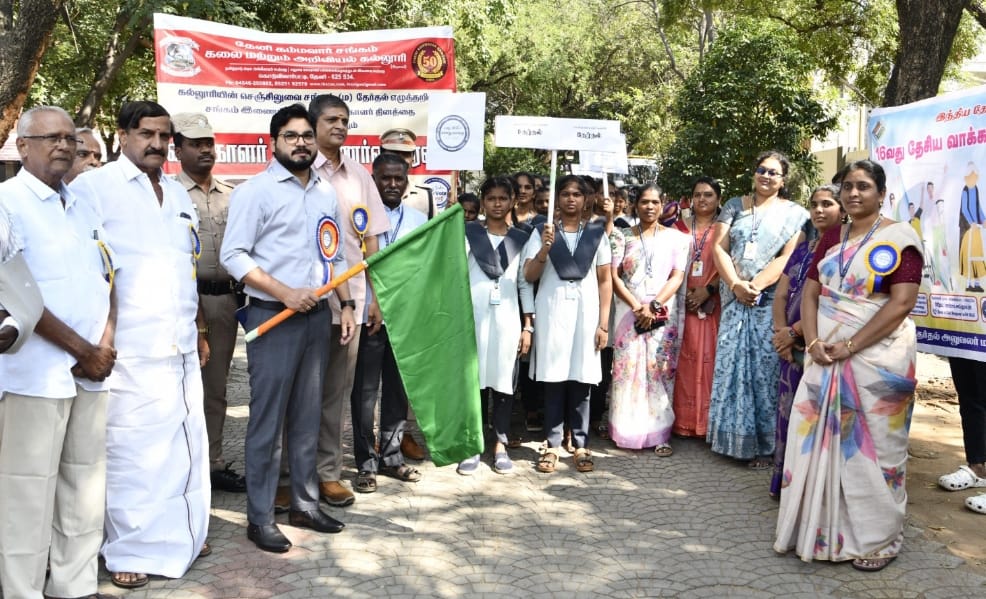 இந்திய தேர்தல் ஆணையத்தின் உத்தரவுப்படி ஆண்டுதோறும் ஜனவரி 25 ஆம் தேதி தேசிய வாக்காளர் தினமாகக் கொண்டாடப்பட்டு வருகிறது 18 வயது பூர்த்தியடைந்த அனைத்து இந்திய குடிமக்களும் வாக்காளர் பட்டியலில் இடம் பெற வேண்டும் ஒவ்வொரு தேர்தலின் போது அனைவரும் தங்களது வாக்குரிமையை செலுத்துவதை உறுதி செய்ய வேண்டும் குறிப்பாக கல்லூரி மாணவர்களில் 18 வயது பூர்த்தியடைந்த இளம் வாக்காளர்கள் வாக்காளர் பதிவு அலுவலர் அலுவலகங்களுக்கு நேரில் சென்று அல்லது voter helpline App என்ற கைப்பேசி செயலி அல்லது voters.eci.gov.in என்ற இணையதளம் முகவரி வாயிலாகவும் விண்ணப்பித்து வாக்காளர் அடையாள அட்டை பெறலாம் ஏற்கனவே பதிவு செய்தவர்கள் தங்கள் பெயர் வாக்காளர் பட்டியலில் இடம் பெற்றுள்ளதை உறுதி செய்து கொள்ள வேண்டும். இது குறித்து பொதுமக்களுக்கு விழிப்புணர்வு ஏற்படுத்த வகையில் தேனி கம்மவார் கலை மற்றும் அறிவியல் கல்லூரியில் மாணவர்களின் விழிப்புணர்வு பேரணியை மாவட்ட கலெக்டர் ரஞ்ஜீத் சிங் கொடியசைத்து துவக்கி வைத்தார்