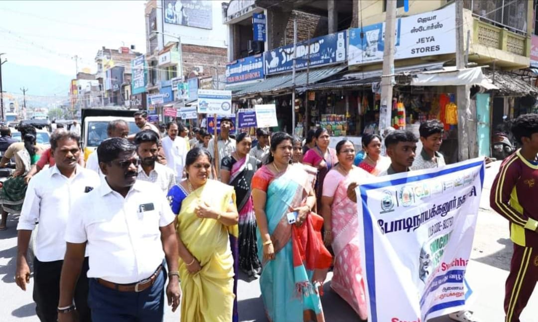 தேனி மாவட்டம் போடிநாயக்கனூர் நகராட்சி நகர் மன்ற தலைவர் சார்பில் தூய்மையே சேவை விழிப்புணர்வு ஊர்வலம் தேனி மாவட்டம் போடிநாயக்கனூர் நகராட்சி நகர் மன்ற தலைவர் ராஜராஜேஸ்வரி சங்கர் தலைமையில் தூய்மை இந்தியா இயக்கம் தொடங்கப்பட்டு 10-வது ஆண்டு நிறைவைக் கொண்டாடும் விதமாக வரும் அக்டோபர் 2-ஆம் தேதி வரை நடைபெறும் தூய்மையே சேவை விழிப்புணர்வு ஊர்வலம் நடைபெற்றது இந்த ஊர்வலம் போடி நகராட்சி அலுவலகத்தில் தொடங்கி நகரின் பிரதான சாலைகளான கட்டபொம்மன் சிலை தேவர் சிலை பஸ் ஸ்டாண்ட் தேனி ரோடு குரங்கனி ரோடு தேவாரம் ரோடு ஆகிய பகுதிகளில் ஊர்வலமாக வந்து மீண்டும் நகராட்சி அலுவலகம் முன் நிறைவடைந்தது ஊர்வலத்தில் நகரை தூய்மையாக வைத்திருக்க பொதுமக்கள் நகராட்சி தூய்மை பணியாளர்களுக்கு ஒத்துழைக்க வேண்டும் . நகரில் உள்ள 33 வார்டுகளிலும் தூய்மை இந்தியா திட்டத்தின் கீழ் குப்பைகளை வாங்க வரும் துப்புரவு பணியாளர்களிடம் குப்பைகளை மக்கும் குப்பை மக்காத குப்பை என பிரித்து வழங்கி மக்கள் சுகாதாரமாக வாழ நகராட்சி எடுக்கும் நடவடிக்கைக்கு பொதுமக்களும் ஒத்துழைக்க வேண்டும் என ஊர்வலத்தில் கோஷங்கள் எழுப்பி பொது மக்களுக்கு விழிப்புணர்வு ஏற்படுத்தினார்கள் இந்த ஊர்வலத்தில் நகராட்சி ஆணையாளர் கா. ராஜலட்சுமி பொறியாளர் வி குணசேகரன் மேலாளர் முனிராஜ் சுகாதார அலுவலர் மணிகண்டன் மற்றும் நகராட்சி அதிகாரிகள் அலுவலர்கள் நகர்மன்ற உறுப்பினர்கள் கலந்து கொண்டனர் ஊர்வல நிறைவில் நகராட்சி நகர் மன்ற உறுப்பினரும் திமுக தலைமை செயற்குழு உறுப்பினருமான எம் சங்கர் நன்றி கூறினார்