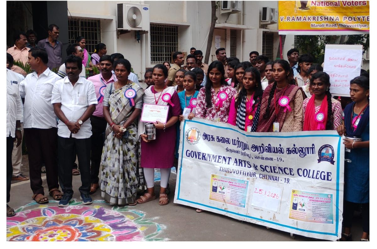 தமிழகத்தில் தேசிய வாக்காளர் தினத்தை முன்னிட்டு திருவொற்றியூர் மண்டல குழு தலைவரும் திருவொற்றியூர் கிழக்குப் பகுதி திமுக செயலாளர் திமு தனியரசு பேரணியை கொடியசைத்து துவக்கி வைத்தார். திருவொற்றியூர் அரசு கலை மற்றும் அறிவியல் கல்லூரியின் மாணவ – மாணவியர்கள் பேராசிரியை செல்வ மீனா தலைமையிலும், வி .ராமகிருஷ்ணா பாலிடெக்னிக் கல்லூரி எல் எஸ் எஸ் மாணவ – மாணவியர்கள் என் எஸ் எஸ் ஆபிஸர் டி . தினகரன் சரவணன் பழனி மற்றும் தாம்சன் ஆகியோர் தலைமையில் இரு கல்லூரி மாணவ மாணவியர்கள் ஒன்றிணைந்து திருவொற்றியூர் ரயில்வே ஸ்டேஷன் அருகில் இருந்து திருவொற்றியூர் மேற்கு மாட வீதி திருவொற்றியூர் தெற்கு மாட வீதி மற்றும் திருவொற்றியூர் நெடுஞ்சாலை வழியாக வாக்காளர்களிடம் விழிப்புணர்வை ஏற்படுத்தும் விதமாக என் வாக்கு என் உரிமை கோஷமிட்டவாறு திருவொற்றியூர் மண்டல அலுவலகத்திற்கு வாக்காளர்கள் விழிப்புணர்வு பேரணியாக ஊர்வலம் வந்தனர்.