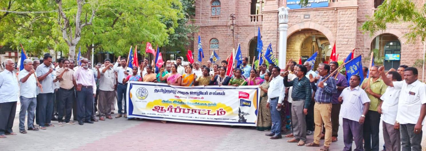 மாவட்டச் செயலாளர் நீதிராஜா கோரிக்கைகளை விளக்கி பேசினார். ஆர்ப்பாட்டத்தில், பொதுத் துறை அரசுத்துறைகளை குறைப்பதை மற்றும் தனியார் மயமாக்குவதை உடனே நிறுத்திட வேண்டும். 5 ஆண்டுகளுக்கு ஒருமுறை கால முறை ஊதிய திருத்தத்தை உறுதி செய்திட வேண்டும். நிறுத்தி வைக்கப் பட்ட அகவிலைப் படியை நிலுவை யின்றி வழங்கிட வேண்டும் என்பது உள்ளிட்ட 10 அம்ச கோரிக்கைகளை வலியுறுத்தினர்.