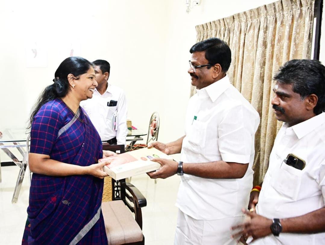 தூத்துக்குடி நாடாளுமன்ற உறுப்பினர் அலுவலகத்தில், திமுக துணைப் பொதுச் செயலாளரும், நாடாளுமன்ற குழுத் தலைவருமான கனிமொழி கருணாநிதியை மீண்டும் அமைச்சராக பொறுப்பேற்ற சிறுபான்மையினர் நலன் மற்றும் வெளிநாடுவாழ் தமிழர் நலத்துறை அமைச்சர் ஆவடி நாசர் நேரில் சந்தித்து வாழ்த்து பெற்றார்.