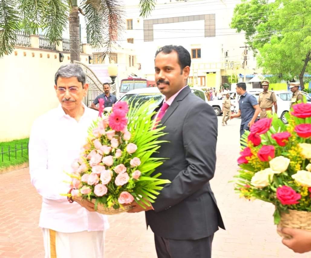 தென்காசி மாவட்டத்தில் பல்வேறு நிகழ்ச்சிகளில் பங்குபெற வந்த தமிழ்நாடு ஆளுநர் ஆர்.என்.ரவி அவர்களை மாவட்ட ஆட்சித்தலைவர் ஏ.கே.கமல்கிஷோர் பூங்கொத்து வழங்கி வரவேற்றார்.