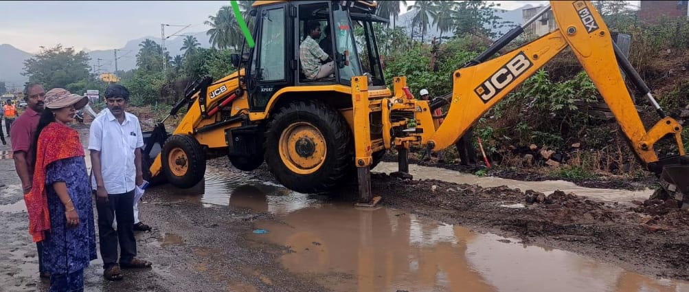 தேனி அல்லி நகரம் நகராட்சி தேனி மதுரை சாலையில் புதிய மேம்பாலம் அமைக்கப்பட்டு வரும் பகுதிகளில் மழைநீர் தேங்கி போக்குவரத்து பாதிக்கப்படதாக வந்த தகவலை யடுத்து பொதுமக்கள் மற்றும் வாகன ஓட்டிகள் எந்த சிரமம் படாமல் செல்ல வேண்டும் என்ற நல்ல எண்ணத்தில் சம்பவ இடத்திற்கு நேரில் சென்று மாவட்ட ஆட்சித் தலைவர் ஆர் வி ஷஜீவனா சென்று பார்வையிட்டு மழை நீரை அப்புறப்படுத்தி போக்குவரத்தை சீரமைத்தார்.