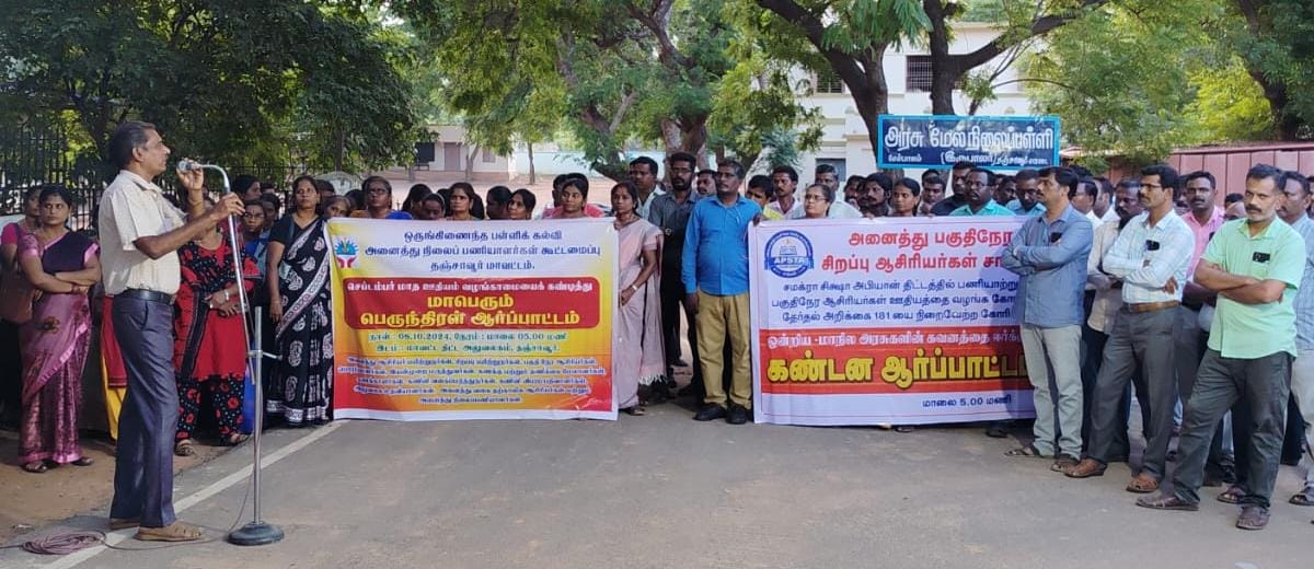 கண்டன ஆர்ப்பாட்டத்தில் ஒருங்கிணைந்த பள்ளிக் கல்வித்துறையில் பணிபுரியும் ஆசிரியர்கள் அனைத்து நிலை பணியாளர்களும் கலந்து கொண்டு ஆதரவளித்தனர்,