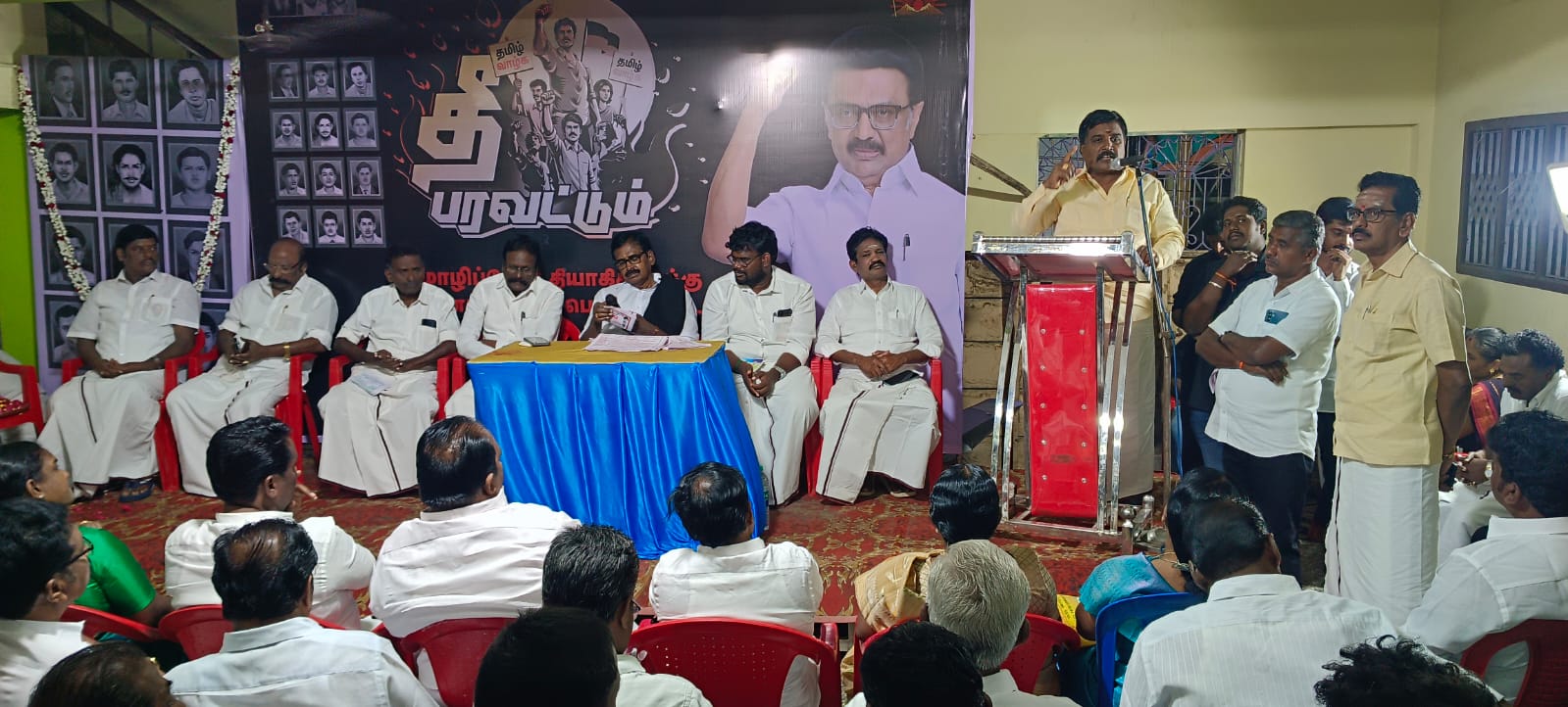 மயிலாடுதுறை மாவட்டம் சீர்காழியில் மொழிப்போர் தியாகிகளுக்கு வீர வணக்கம் நாள் பொதுக்கூட்டம் நடைபெற்றது நகர செயலாளர் தம்பி மா சுப்புராயன் ஏற்பாட்டில் நடைபெற்ற நிகழ்ச்சியில் மாவட்ட செயலாளர் பூம்புகார் சட்டமன்ற உறுப்பினருமான நிவேதா எம் முருகன் தலைமை தாங்கினார் முன்னாள் மத்திய அமைச்சர் கழக உயர்நிலை செயல்திட்ட குழு உறுப்பினர் எஸ் எஸ் பழனி மாணிக்கம் கலந்து கொண்டு சிறப்புரை ஆற்றினார் நிகழ்ச்சியில் சீர்காழி சட்டமன்ற உறுப்பினர் எம் பன்னீர்செல்வம் ஒன்றிய செயலாளர்கள் பிரபாகரன் பஞ்சு குமார் ரவிக்குமார் மலர்விழி திருமாவளவன் உன்கிட்ட கழக நிர்வாகிகள் கலந்து கொண்டனர் மேலும் அதிமுகவில் இருந்து விலகி அதிமுக வழக்கறிஞர்