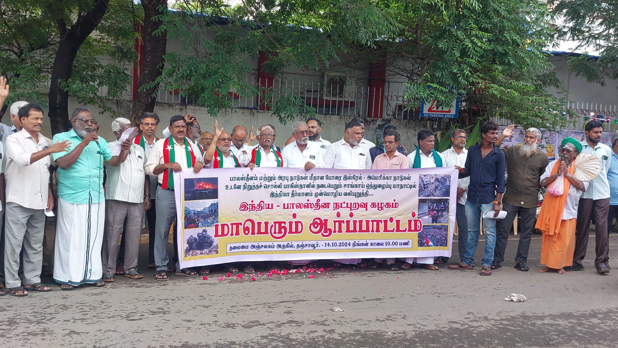 இரண்டாம் உலகப்போருக்கு பின்னதாக யூதர்கள் நாடு இல்லாமல், இடம் இல்லாமல் அலைந்து திரிந்த போது பாலஸ்தீனம் ஆதரவு தந்ததன் அடிப்படையில் இஸ்ரேல் நாடு உருவானது. பின்னர் வல்லரசாக உருமாறி ஆதரவு தந்த பாலஸ்தீனத்தை அபகரிக்க தொடர்ந்து போர் நடத்தி வருகிறது. பாலஸ்தீனத்தின் தந்தை என்று அழைக்கப்படுகின்ற யாசர் அராபத் பாலஸ்தீன விடுதலைக்காக முழுமையாக தன்னை அர்ப்பணித்து போராடினார் . தொடர்ந்து பாலஸ்தீனத்தின் இறையாண்மைக்காக மக்கள் போராடி வருகின்றனர். இந்த நிலையில் கடந்த ஓராண்டுகளுக்கும் மேலாக பாலஸ்தீனம் காசா நகரத்தின் மீது கொடூரமான போரை சர்வதேச போர் விதிமுறைகளையும் மீறி, தடை செய்யப்பட்ட ஆயுதங்களையும், குண்டுகளையும் வீசி கொன்று குவித்து வருகிறது. பாலஸ்தீனத்திற்கு ஆதரவு தெரிவித்த லெபனான், சிரியா, ஏமன், ஈரான் உள்ளிட்ட நாடுகள் மீது இஸ்ரேல் வல்லரசு அமெரிக்காவுடன் கூட்டு சேர்ந்து கொடூரமான போரை தொடுத்துள்ளது. இந்தியா ஆயுதங்களையும், தொழிலாளர்களையும் இஸ்ரேலுக்கு அனுப்பக்கூடாது, தூதரக உறவை முறித்துக் கொள்ள வேண்டும் என்பது உள்ளிட்ட கோரிக்கைகள் வலியுறுத்தப்பட ஆர்ப்பாட்டத்தை இந்திய, பாலஸ்தீன நட்புறவுக் கழகத்தின் மாநில தலைவர் கசி.விடுதலைக்குமரன் முடித்து வைத்தார்.