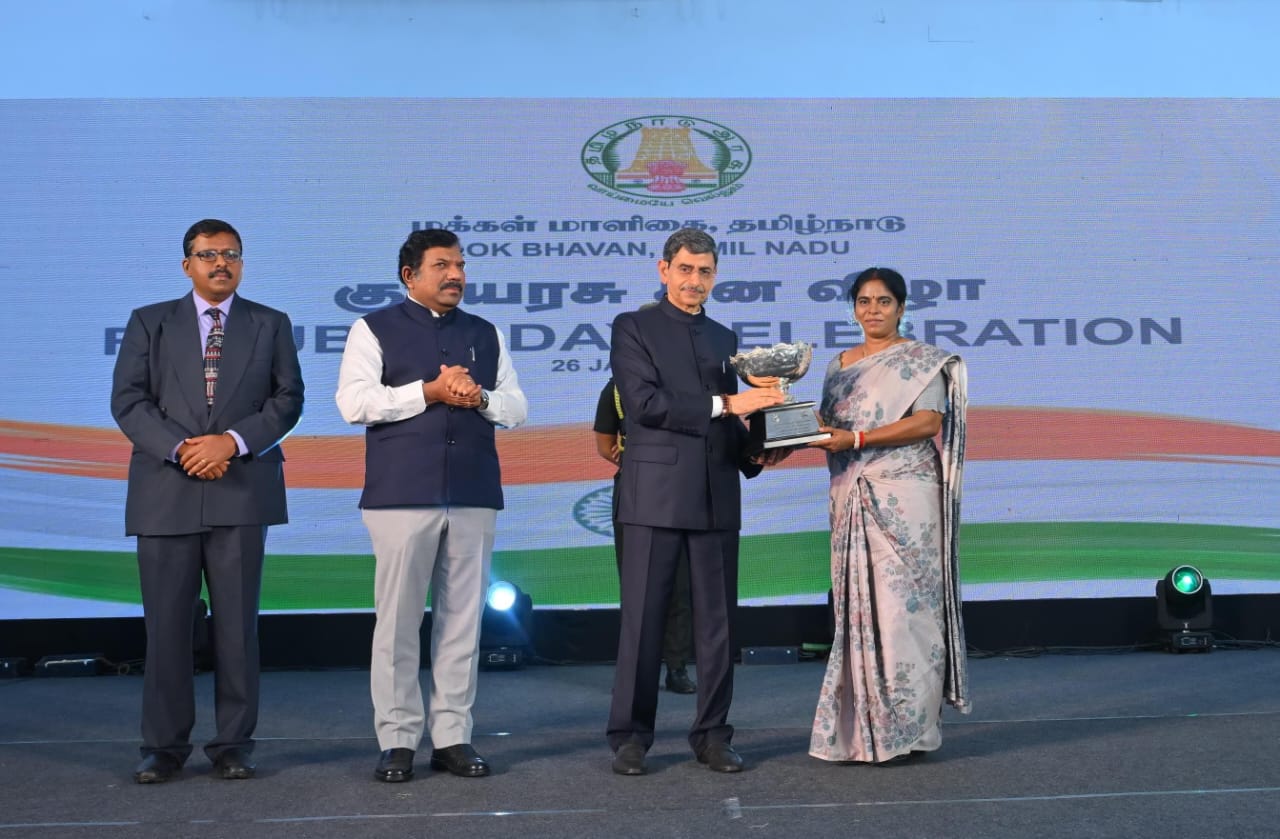 பெரம்பலூர்.ஜன.26. சென்னை ராஜ்பவனில் இன்று (26.1.2026) நடைபெற்ற நிகழ்ச்சியில் முன்னாள் படை வீரர்களின் நலனை காத்திடும் வகையில் கொடிநாள் நிதி திரட்டுவதில் மாநிலத்தில் மூன்றாம் இடம் பிடித்த பெரம்பலூர் மாவட்டத்திற்காக தமிழ்நாடு ஆளுநர் ஆர். என். ரவி, அரசு தலைமை செயலாளர் முருகானந்தம், முன்னிலையில், பெரம்பலூர் மாவட்ட ஆட்சித்தலைவர் ந.மிருணாளினி, அவர்களுக்கு கேடயம் வழங்கிப் பாராட்டினார்.