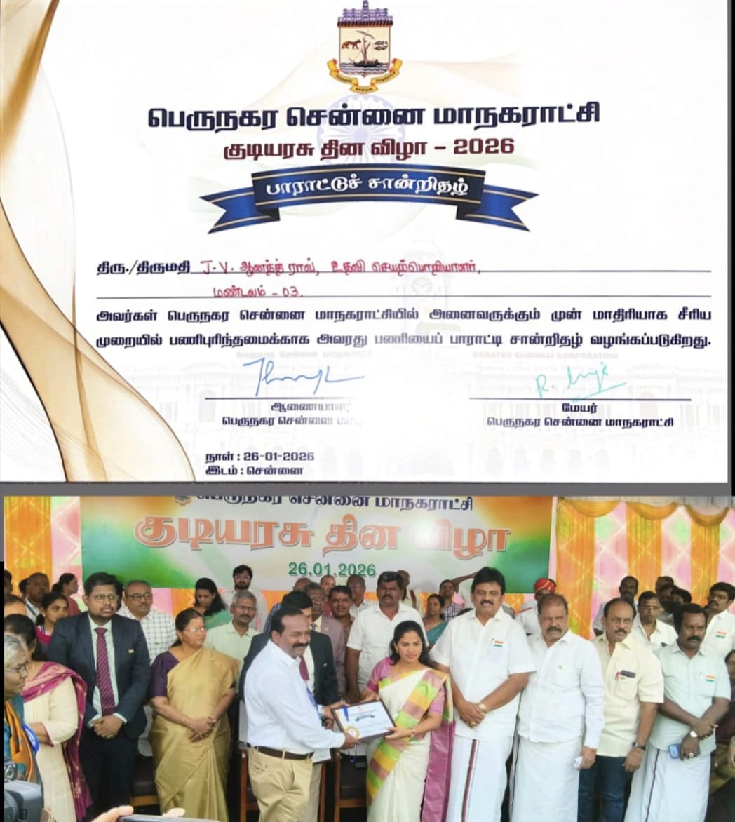 சென்னை மாநகராட்சி மாதவரம் மண்டலம் 3 ன் மக்களின் பொதுநல குறைகள் மற்றும் சிறந்த திட்டங்களை மக்களிடம் கொண்டு சேர்த்த அதிகாரிகள் மேலும் சிறந்த சுற்றுலா தலமாக அமைத்தக்காக சிறந்த பணியாளருக்கான விருது மாதவரம் மண்டல உதவி செயற் பொறியாளர் ஆனந்த்ராவ் அவர்களுக்கு குடியரசு தினத்தன்று சென்னை மாநகராட்சி மேயர் பிரியா நற்சான்றிதழ் வழங்கி போது எடுக்கப்பட்ட படம்