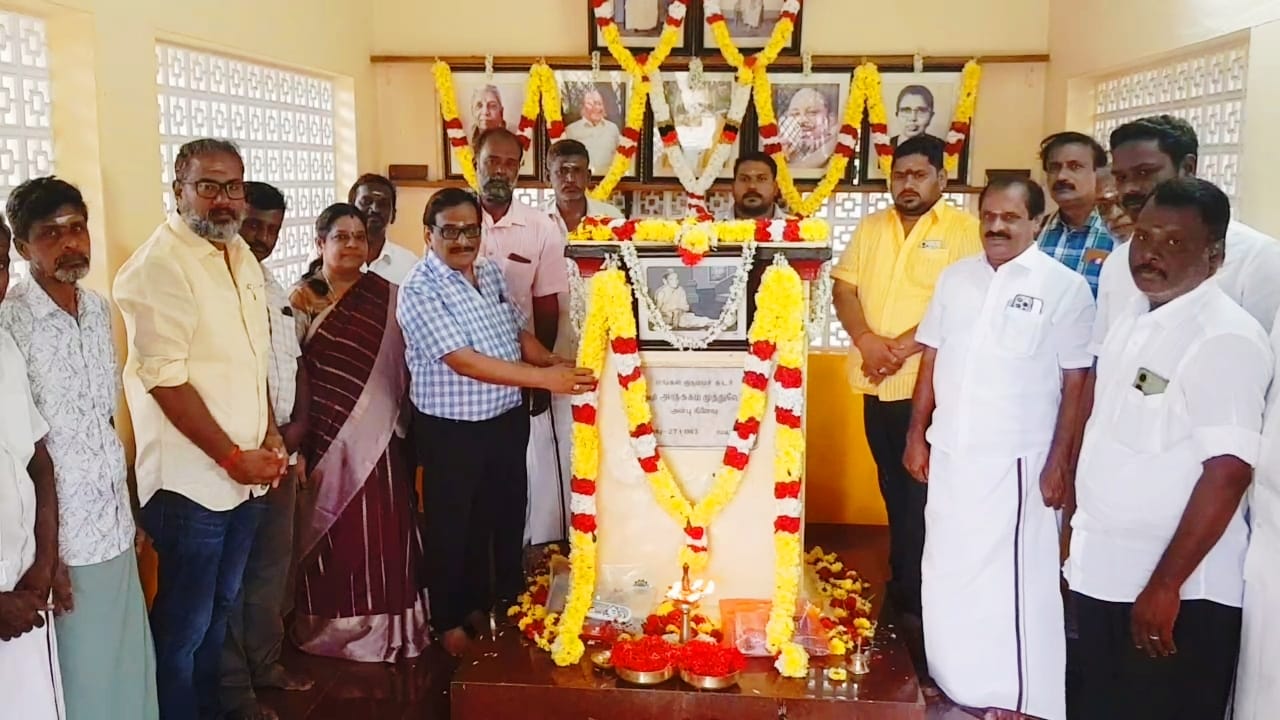 திருவாரூர் அருகே மறைந்த முன்னாள் முதல்வர் கருணாநிதியின் தாயார் அஞ்சுகம் அம்மையார் நினைவிடத்தில் திமுகவினர் மலர் தூவி மரியாதை செலுத்தினார்