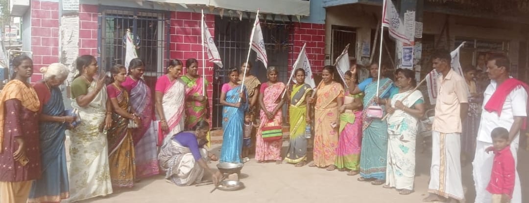 குடவாசலில் ஒன்றிய பாஜக அரசை கண்டித்து இந்திய ஜனநாயக மாதர் சங்கத்தின் சார்பாக நூதன போராட்டத்தில் ஈடுபட்டனர்.