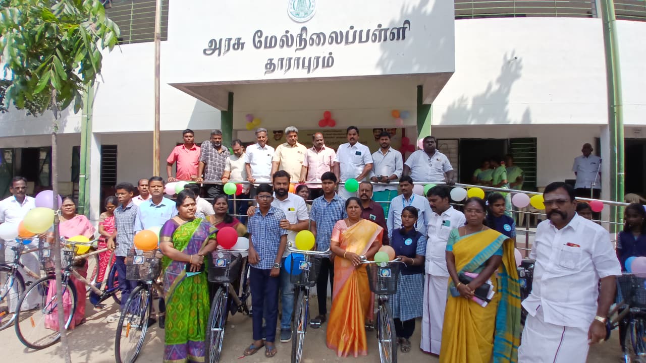 திருப்பூர் மாவட்டம் தாராபுரம் 5 சாலை சந்திப்பு பகுதியில் அமைந்துள்ள அரசு மேல்நிலைப் பள்ளி வளாகத்தில் தாராபுரம் சுற்றுவட்டார பகுதியில் உள்ள 6 பள்ளிகளில் பயிலும் மாணவ மாணவிகள் சுமார் 339 நபர்களுக்கு 15 லட்சம் மதிப்பீட்டில் மிதிவண்டிகள் வழங்கப்பட்டது.