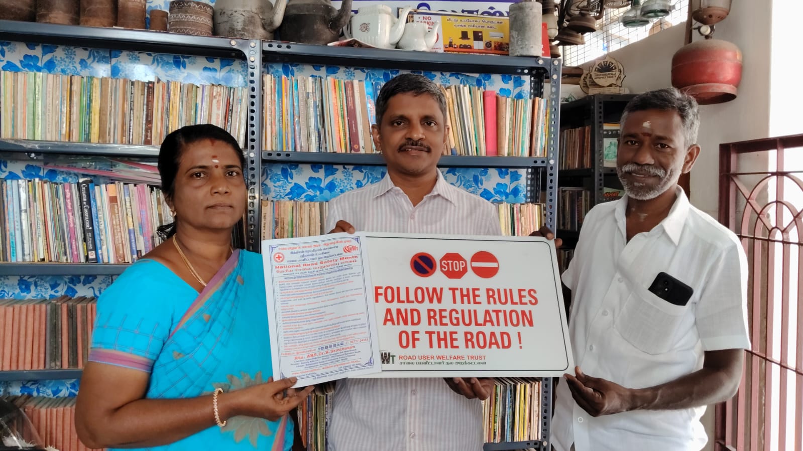 சாலை பயனீட்டாளர் நல அறக்கட்டளை நிர்வாக அறங்காவலர் பெ. அய்யாரப்பன் சாலை பாதுகாப்பு விழிப்புணர்வு துண்டு பிரசுரங்களை அமிர்தம் சமூக சேவை அறக்கட்டளை நிர்வாக அறங்காவலர் யோகா ஆசிரியர் பெ.விஜயகுமார், வழக்கறிஞர் சித்ரா ஆகியோரிடம் வழங்கி பேசுகையில்,சாலை பாதுகாப்பு உயிர் பாதுகாப்பு ஆகும்.சாலையில் விபத்துகள் நிகழாத வண்ணம் தடுப்பதற்காக, போக்குவரத்து காவல்துறையினர் பணி செய்கின்றனர். அதற்காக மக்கள் பின்பற்ற வேண்டிய சில சாலை விதிகளை அரசு வரையறுத்துள்ளது.