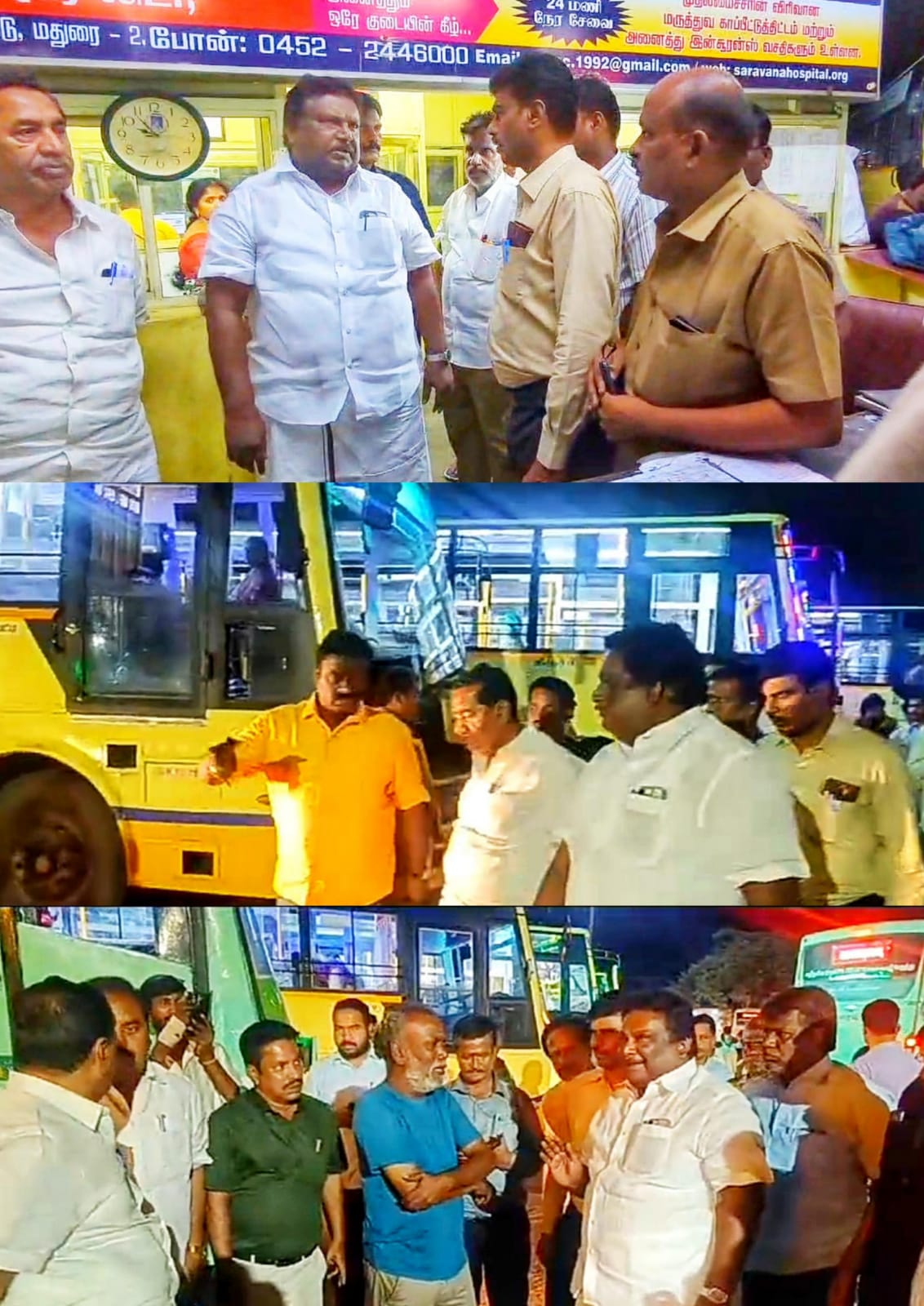 அப்போது போக்குவரத்துத் துறை அதிகாரிகளும் உடன் இருந்தனர். அவர்களிடம், வெளியூர்களுக்கு பயணிகளை ஏற்றிச்செல்ல பஸ் வசதி செய்யப்பட்டு இருப்பது குறித்து கேட்டு அறிந்தனர். சாதாரண கட்டண பஸ்கள் எவ்வளவு, சிறப்பு கட்டண பஸ்கள் எத் தனை? தற்போது மாட்டுத்தாவணி பஸ் நிலையத்தில் கூடி இருக்கும் பயணிகளுக்கு ஏற்றவாறு பஸ் வசதிசெய்யப்பட்டு உள்ளதா?எனவும் கேட்டறிந்தனர்.