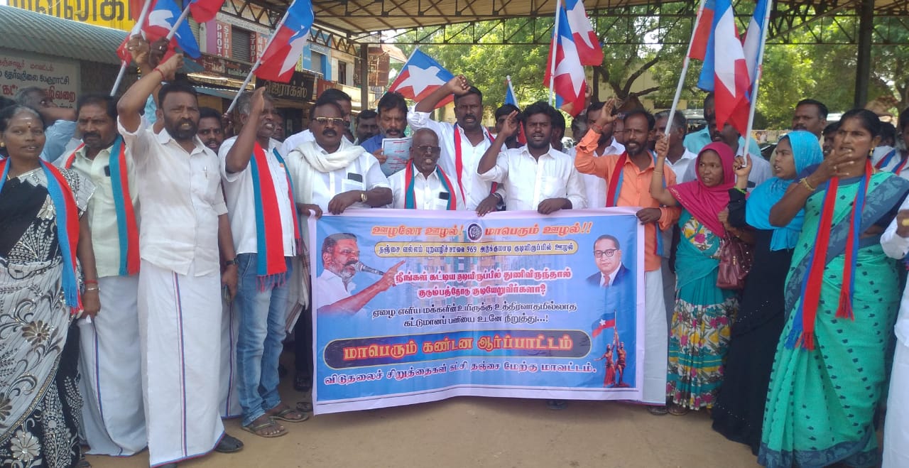 தஞ்சாவூர் வல்லம் பேரூராட்சிக்கு உட்பட்ட அய்யனார் கோயில் புறவழிச்சாலை அருகே தமிழ்நாடு அரசு நகர்ப்புற வாழ்விட மேம்பாட்டு வாரியத்தால் கட்டப்படும் 13 அடுக்கு மாடி குடியிருப்பு கட்டுமானத்தில் 969 வீடுகள் கட்டப்பட்டுள்ளன இதில் சுமார் 150 கோடி ரூபாயில் பெருமளவில் ஊழல் நடந்துள்ளது என்று கூறி ஊழலைக் கண்டித்தும் ஏழை, நடுத்தர மக்களின் உயிர் பாதுகாப்பு கருதியும் தரமற்ற கட்டுமானத்தை நிறுத்தக்கோரி ஊழலில் ஈடுபட்ட ஒப்பந்ததாரர்கள், அரசு பொறியாளர்கள், தரச்சான்று அளித்த அதிகாரிகள் மீது சட்ட நடவடிக்கை எடுக்க வலியுறுத்தி விடுதலைச் சிறுத்தைகள் கட்சியின் சார்பில் வல்லம் பேருந்து நிலையத்தில் தஞ்சை மேற்கு மாவட்ட செயலாளர் ச. தமிழன் தலைமையில் கண்டன ஆர்ப்பாட்டம் நடைபெற்றது.