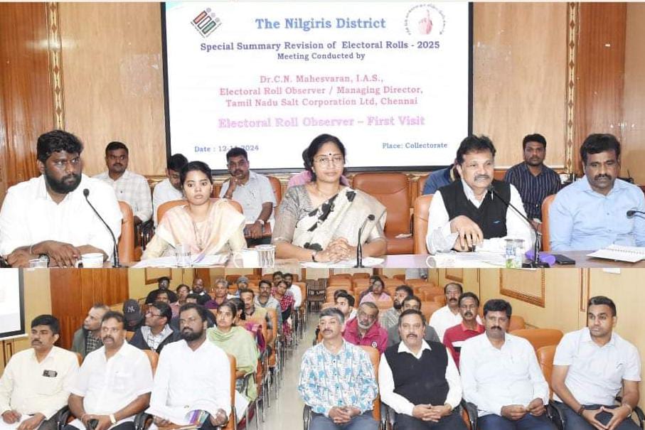 நீலகிரி மாவட்டத்தில், நீலகிரி மாவட்ட வாக்காளர் பட்டியல் பார்வையாளர் அவர்கள், மாவட்ட ஆட்சித்தலைவர் அவர்கள் முன்னிலையில், அங்கீகரிக்கப்பட்ட அரசியல் கட்சி பிரதிநிதிகளுடன் சிறப்பு சுருக்கமுறைத்திருத்தம் 2025 தொடர்பான பணிகள் குறித்து ஆலோசனை மேற்கொண்டார்