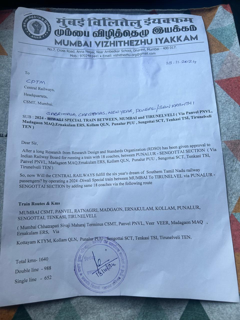 நாங்கள் அளித்த மனுவை பரிசீலனை செய்து மத்திய ரயில்வே சிறப்பு ரயில் இயக்க தென்னக ரயில்வே க்கு Proposal அனுப்பியது தென்னக ரயில்வே கொங்கன் ரயில்வே ஒப்புதல் கொடுத்து புதிய வழித்தடத்தில் இயக்க concurrence/approval அனுமதி அளித்தது ஆனால் ரயில் பெட்டிகள் Rake இல்லை னு ரயில் இயக்க வில்லை??.
