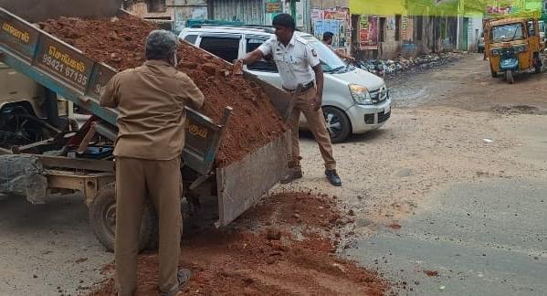 இதைப் பார்த்த திண்டுக்கல் நகர் போக்குவரத்து காவல் நிலைய சார்பு ஆய்வாளர்.விக்னேஷ்குமார் காவலர்.மோகன் உள்ளிட்டோர் பள்ளத்தில் மண் கொட்டி சீர் செய்தனர்.