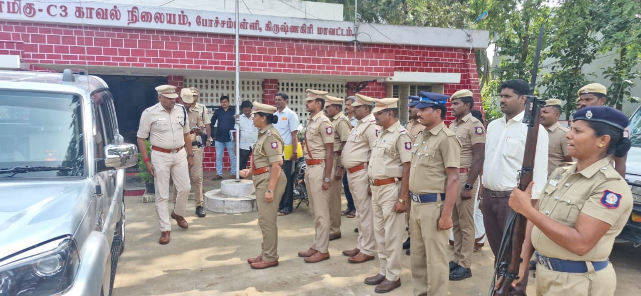போச்சம்பள்ளி கிருஷ்ணகிரி மாவட்ட காவல் கண்காணிப்பாளர் தங்கதுரை பர்கூர் உட்கோட்டம், போச்சம்பள்ளி காவல் நிலையத்திற்கு நேரில் சென்று வருடாந்திர ஆய்வு மேற்கொண்டார்கள். காவல் நிலையத்தில் பராமரிக்கப்படும் பதிவேடுகளை ஆய்வு செய்தும், நிலையத்தில் பதிவு செய்யப்பட்டுள்ள வழக்குகளின் தற்போதைய நிலைகளையும் ஆய்வு செய்து அதிகாரிகள் மற்றும் காவலர்களுக்கு அறிவுரைகள் வழங்கினார்.