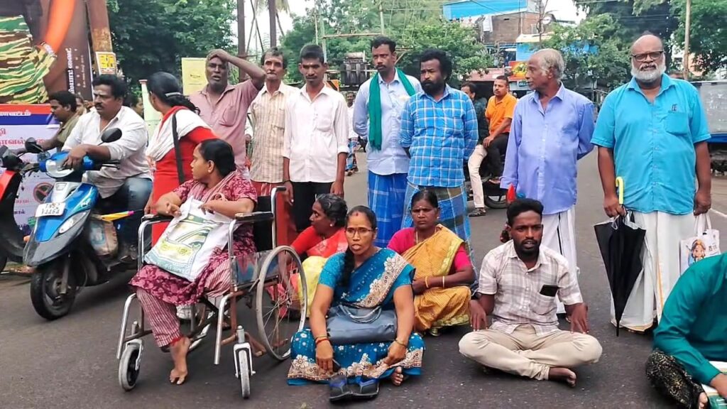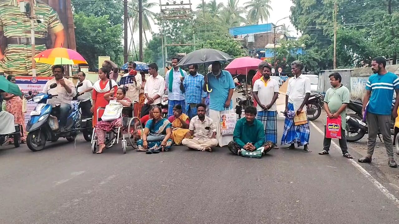 சீர்காழி அரசு மருத்துவமனை எதிரே மாற்றுத்திறனாளிகள் அலுவலர் வராததை கண்டித்து மாற்றுத்திறனாளிகள் மழையில் நனைந்தபடி திடீர் சாலை மறியல். போலீசார் பேச்சுவார்த்தை.
