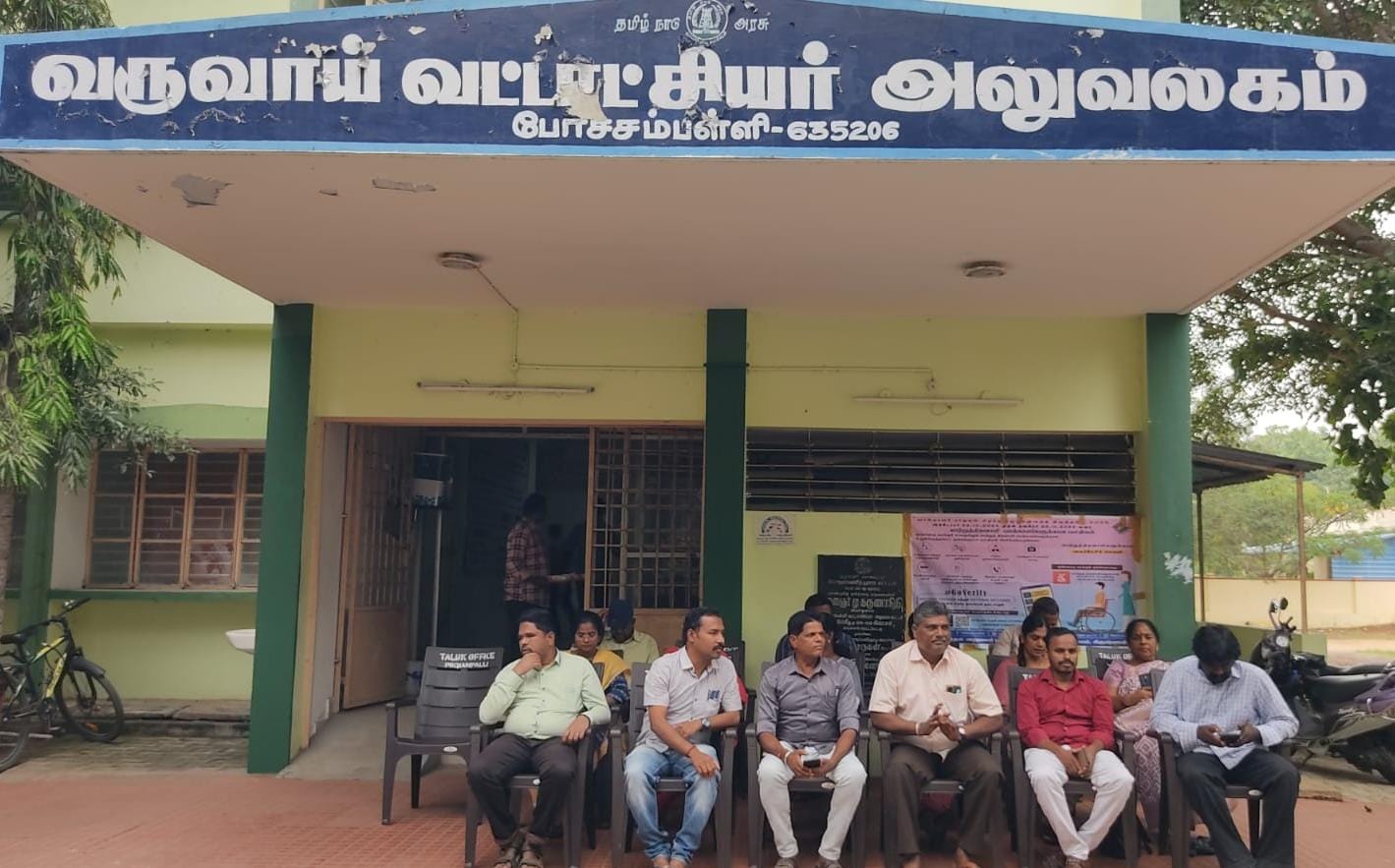 போச்சம்பள்ளி வட்டாட்சியர் அலுவலகம் முன்பு தமிழ்நாடு வருவாய்த்துறை அலுவலர் சங்கம் சார்பில் மூன்றாம் கட்ட பணி புறக்கணிப்பு மற்றும் தொடர் காத்திருப்பு போராட்டம் நடைபெற்று வருகிறது.