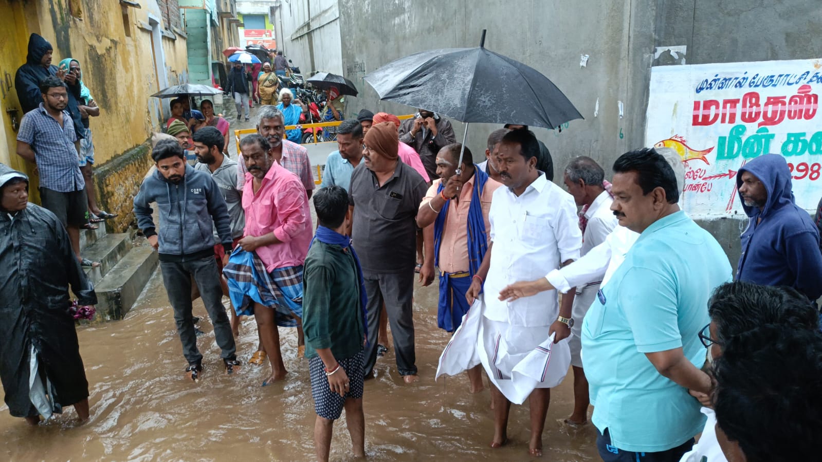 அரூர் பேரூராட்சி தூய்மை பணியாளர் குடியிருப்பு பகுதிகளில் பழுது மற்றும் மீட்புப் பணி அரூர் அதிமுக எம்எல்ஏ சம்பத்குமார் ஆய்வு செய்தார்