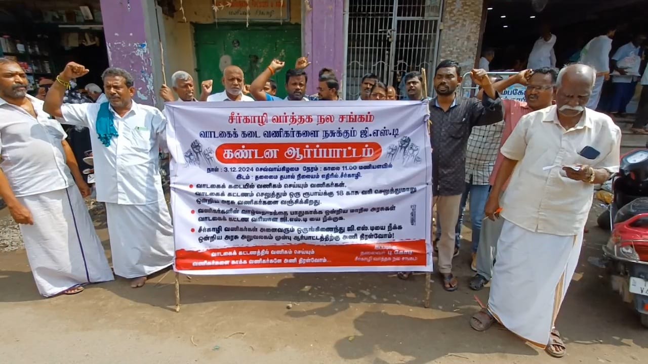 சீர்காழியில் வர்த்தக நல சங்கம் சார்பில் வாடகை கட்டண ஜி.எஸ்.டி வரி உயர்வை கண்டித்து கண்டன ஆர்ப்பாட்டம்.