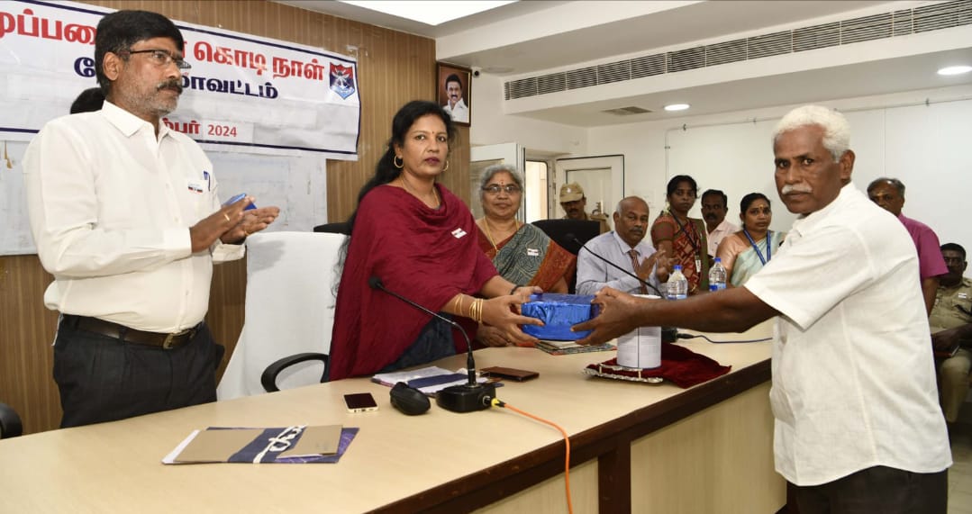 தேனி மாவட்ட ஆட்சியர் அலுவலகத்தில் முன்னாள் படைவீரர் நலத் துறையின் சார்பில் முப்படையினர் கொடி நாளை நடைபெற்ற முன்னிட்டு விழாவில் மாவட்ட ஆட்சித் தலைவர் ஆர். வி. ஷஜீவனா முன்னாள் படை வீரர்களுக்கு பரிசுகளை வழங்கினார்