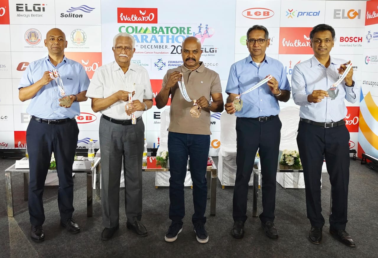 கோயம்புத்தூர் புற்றுநோய் அறக்கட்டளைக்கு (சிசிஎஃப்) நிதி திரட்டும் வகையில், வாக்கரூ கோயம்புத்தூர் மாரத்தானின் 12-வது பதிப்பு வரும் டிசம்பர் 15-ஆம் தேதி நடைபெறுகிறது. இதில் கலந்துகொள்ள 21,000-க்கும் மேற்பட்டோர் பதிவுசெய்துள்ளனர். இந்நிலையில் இன்று, பங்கேற்பாளர்களுக்கான அதிகாரப்பூர்வ டி-ஷர்ட் மற்றும் மாரத்தான் ஓடி முடிப்பவர்கள் பெறவிருக்கும் பதக்க வெளியீட்டு நிகழ்வு கோவை புரூக்பீல்ட்ஸ் வணிக வளாகத்தில் நடைபெற்றது.