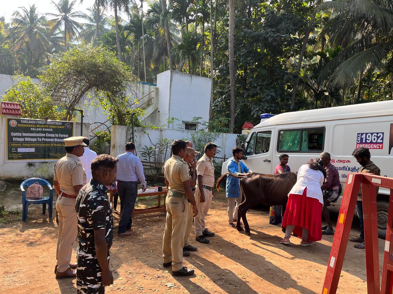 திண்டுக்கல் மாவட்டம் பழனி, கொடைக்கானல் ரோடு தேக்கந்தோட்டம் பகுதியில் தமிழ்நாடு வனத்துறை மற்றும் கால்நடை பராமரிப்புத் துறையின் சார்பாக வனப்பகுதிக்கு அருகில் உள்ள கால்நடைகளுக்கு தடுப்பூசி செலுத்தப்பட்டது. இதன் மூலம் வனத்தை ஒட்டியுள்ள கிராம பகுதிகளில் உள்ள, கால்நடைகள் மூலம் வனத்திற்குள் வாழும் வனவிலங்குகளுக்கு நோய் பரவாமல் தடுக்க முடியும். மேலும், கால்நடைகளை நோய் இல்லாமல் வாழவைப்பதுடன் வனத்தை ஒட்டி உள்ள கிராமங்களின் சுற்றுச்சூழலையும் பாதுகாக்கலாம். இந்த தடுப்பூசி முகாமில் பழனி கால்நடை பராமரிப்பு துறை உதவி இயக்குனர் மருத்துவர் சுரேஷ், பாலசமுத்திரம் கால்நடை உதவி மருத்துவர் செல்வகுமார், வனவர் பழனிச்சாமி ஆகியோர் கலந்து கொண்டனர்.
