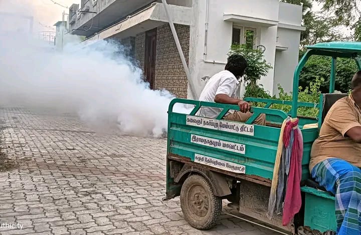 ராமநாதபுரம் மாவட்டத்தில் உள்ள கமுதி பேரூராட்சி சார்பாக நகர்பகுதிகளில் தினமும் ஒருவார்டில் உள்ள அனைத்துதெருக்களிலும் உள்ள கொசு பெருக்கத்தை கட்டுப்படுத்தும் வகையில் கொசு மருந்து அடிக்கும் பணியானது நடைபெற்று வருகிறது
