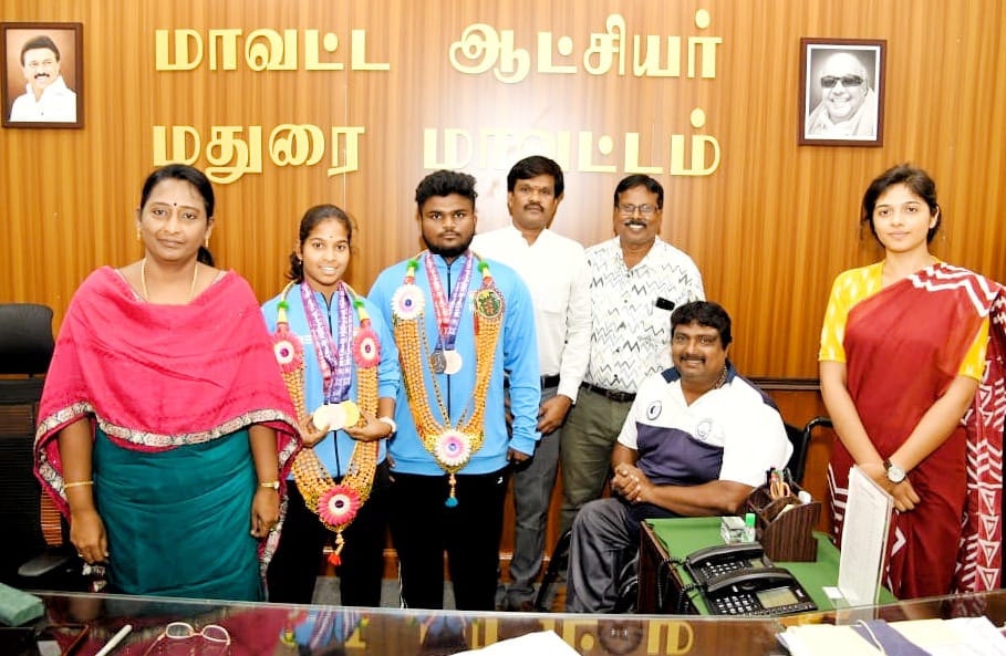 அதே போன்று மதுரை சட்டக்கல்லூரி மாணவர் வருண் குண்டு எறிதலில் வெள்ளிப்பதக்கமும், வட்டு எறிதலில் வெண்கல பதக்கமும் பெற்றார்.சர்வதேசபோட்டிகளில் சாதனை படைத்த மாற்றுத்திறனாளி கல்லூரி மாணவர்கள் கலெக்டர் சங்கீதாவை சந்தித்து வாழ்த்து பெற்றனர். அப்போது உதவி கலெக்டர் (பயிற்சி) வைஷ்ணவி பால், விளையாட்டு மேம்பாட்டு ஆணைய மதுரை மண்டல முதுநிலை மேலாளர் வேல்முருகன், மாவட்ட விளையாட்டு அலுவலர் ராஜா, மாற்றுத்திறன் படைத்த வீரர்களின் பயிற்சியாளர் ரஞ்சித்குமார் ஆகியோர் உடன் இருந்தனர்.