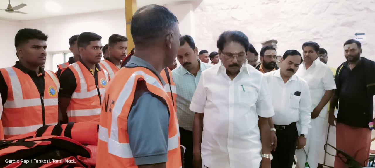 தென்காசி மாவட்டத்தில் பெய்து வரும் கனமழையினால் பொதுமக்களை காப்பாற்றும் வண்ணம் தயார் நிலையில் உள்ள தமிழ்நாடு பேரிடர் மீட்பு குழுவை பேரிடர் மேலாண்மை துறை அமைச்சர் கே கே எஸ் எஸ ஆர் ராமச்சந்திரன் கண்காணிப்பு அலுவலர் சங்கர் மாவட்ட ஆட்சியர் ஏ.கே. கமல் கிஷோர் தென்காசி நகர் மன்ற தலைவர் சாதிக் செங்கோட்டை முன்னாள் நகர்மன்ற தலைவர் ரஹீம் தென்காசி மேற்கு ஒன்றிய செயலாளர் திவான் ஒலி ஆகியோருடன் பார்வையிட்டார்.