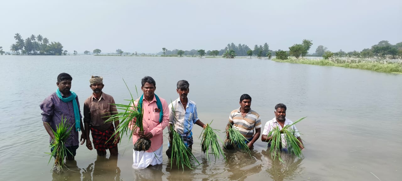 தஞ்சாவூர் மாவட்டம் திருவையாறு தாலுக்கா திருப்பழனம் பகுதியில் உள்ள சிறுபுலியூர், ராயன்பேட்டை ,கார்குடி, பருத்திகுடி அம்மாள் , திங்களூர் ,70பெரமூர், தென்னஞ்சேரி, குண்டக்குடி ,ஆச்சனூர் ஆகிய கிராமங்களில் இடுப்பளவு தண்ணீரில் சுமார் 15.000ஆயிரம் ஏக்கர் இளம் நடவு நெல்பயிர்கள் முழுவதும் முழுகி கடல்போல் தண்ணீர் சூழ்த்து பயிரிடப்பட்ட நெற்பயிர் முழுவதும் பாதிக்கப்பட்டுள்ளது.