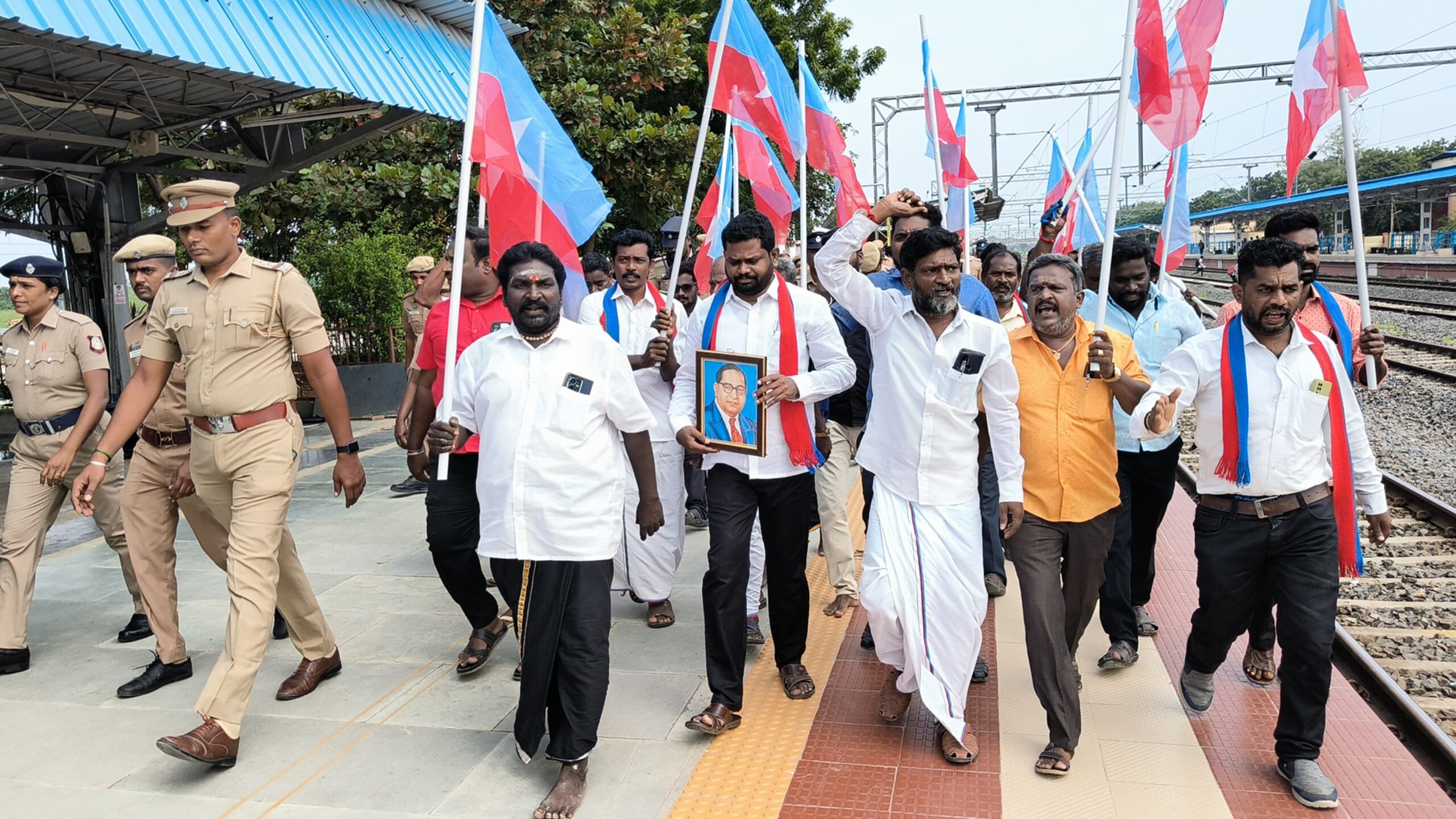 அம்பேத்கரை இழிவாக பேசிய மத்திய அமைச்சர் அமித்ஷாவை கண்டித்து அரியலூர் மாவட்ட விடுதலை சிறுத்தைகள் கட்சி சார்பில், அரியலூர் ரயில் நிலையத்தில் போராட்டம் நடைபெற்றது. அரியலூர் மேற்கு மாவட்ட செயலாளர் அங்கனூர் சிவா தலைமையில் நடைபெற்ற இந்த போராட்டத்தில், விடுதலை சிறுத்தைகள் கட்சியை சேர்ந்தவர்கள் திரளாக கலந்து கொண்டனர். ரயில் நிலையத்தில் அப்போது வந்த ரயிலை மறித்து போராட்டத்தில் ஈடுபட முற்பட்டபோது பாதுகாப்பு பணியில் இருந்த ரெயில்வே போலீசாரும், அரியலூர் போலீசாரும் சேர்ந்து அவர்களை தடுத்து நிறுத்தினர். பின்னர் அவர்கள் உள்துறை அமைச்சர் அமித்ஷாவிற்கு எதிராக கண்டன கோஷங்களை எழுப்பியவாறு சென்றனர். இதையடுத்து அனுமதியின்றி போராட்டத்தில் ஈடுபட்டதாக விடுதலை சிறுத்தைகள் கட்சியை சேர்ந்த மொத்தம் 22 பேரை போலீசார் கைது செய்து தனியார் திருமண மண்டபத்தில் தங்க வைத்தனர்.