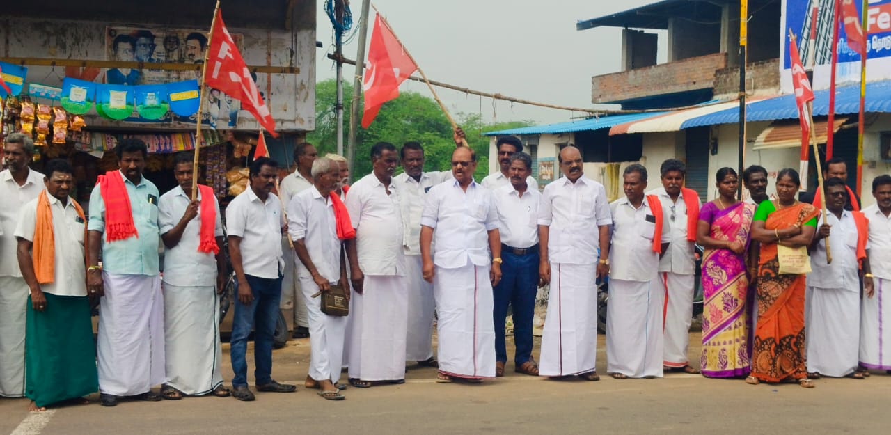 ரவி, ஒன்றிய தலைவர் ஜி. பிரபாகரன், இளைஞர் பெருமன்றத்தின் ஒன்றிய செயலாளர் வி. பாக்கியராஜ், ஒன்றிய தலைவர் கே. சுதாகர், விவசாய சங்கத்தின் பொருளாளர் ஏ. மருதையன், சிபிஎம் விவசாய சங்க ஒன்றிய தலைவர் இளங்கோவன், தொழிலாளர் சங்க ஒன்றிய தலைவர் பாலையா, முன்னாள் சிபிஎம் ஒன்றிய கவுன்சிலர் ஆர்.ஜே. நடராஜன் ஆகியோர் இந்திய கம்யூனிஸ்ட் கட்சி, மார்க்சிஸ்ட் கம்யூனிஸ்ட் கட்சி இணைந்து ஆர்ப்பாட்டத்தை நடத்தினர். ஆர்ப்பாட்டத்தில் அமைச்சர் அமித்ஷா தேசத்தந்தை காந்தி, முன்னாள் பிரதமர் நேரு, இந்திராகாந்தி, தஞ்சை பெரியார் உள்ளிட்ட தலைவர்களை தொடர்ந்து அவதூறு பரப்பி வரும் அமித் ஷா தற்போது பாராளுமன்ற குளிர்கால கூட்டத்தொடரில் டாக்டர் அம்பேத்கர் மீது அவதூறு பரப்பி பேசினார். உள்துறை அமைச்சர் அமித்ஷாவை அமைச்சரவையில் இருந்து பணிநீக்கம் செய்ய வலியுறுத்தி கோசம் எழுப்பினர். நிகழ்வில் பெண்கள் உள்பட கட்சியினர் திரளாக கலந்து கொண்டனர்.