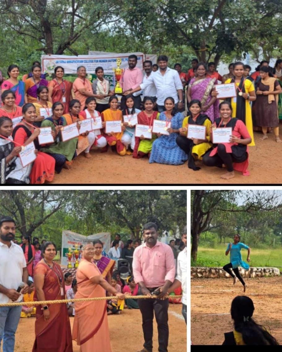 100மீட்டர் ஓட்டப்பந்தயத்தில் C. நல்லாக்காள், இளங்கலை மூன்றாமாண்டு வரலாற்றுத்துறை மாணவி முதல் பரிசையும். K. பவித்ரா, இளங்கலை மூன்றாமாண்டு வணிகவியல் மற்றும் பயன்பாட்டியல்துறை மாணவி இரண்டாம் பரிசையும், V. சுகன்யா முதலாமாண்டு தமிழ்த்துறை மாணவி மூன்றாம் பரிசையும் பெற்றனர், கயிறு இழுத்தல் போட்டியில் ஜான்சி ராணி அணி மாணவிகள் முதல் பரிசையும், மணிமேகலை அணி மாணவிகள் இரண்டாம் பரிசையும் பெற்றனர், இறுதியாக, போட்டியில் வெற்றி பெற்ற மாணவிகளுக்கு பரிசுகள் வழங்கப்பட்டது,