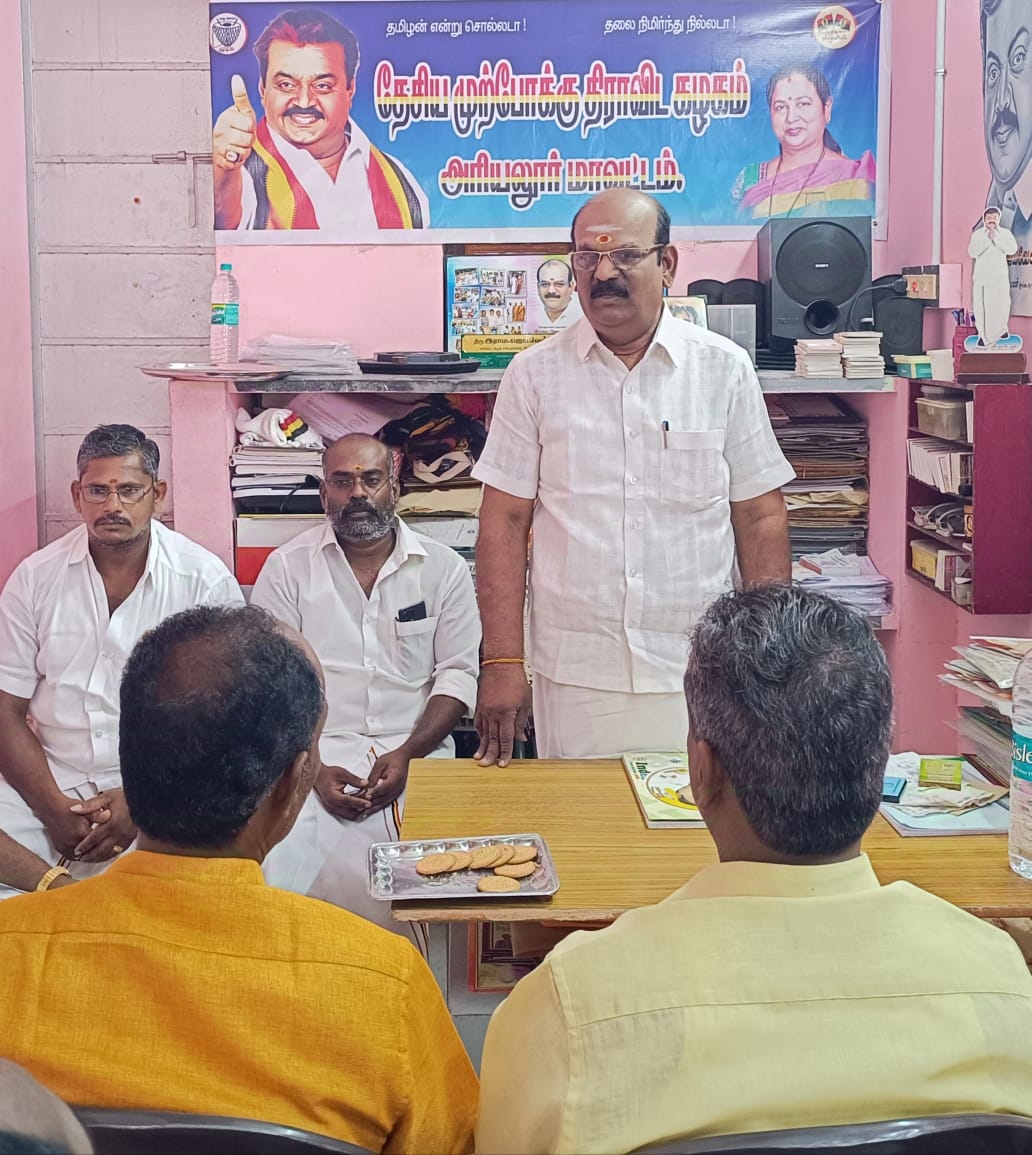 அரியலூர் மாவட்ட தேமுதிக தலைமை அலுவலகத்தில் மாவட்ட கழக செயலாளர் இராம. ஜெயவேல் தலைமையில் நடைபெற்றது முன்னிலை மாவட்ட கழக பொருளாளர் சக்திவேல் மாவட்ட துணை செயலாளர்கள் சக்தி பாண்டியன், ரவி தலைமை செயற்குழு உறுப்பினர் ஆனந்தன் நிகழ்ச்சிக்கு வரவேற்புரை அரியலூர் வடக்கு ஒன்றிய அவைத்தலைவர் ரவி மற்றும் நிகழ்ச்சியில் கலந்து கொண்டவர்கள் பொதுக்குழு உறுப்பினர்கள் கருப்பையா, மோகன்தாஸ், திருமானூர் கிழக்கு மேற்கு ஒன்றிய கழக செயலாளர்கள் ராஜ்குமார், ஜெகதீசன் ஆண்டிமடம் ஒன்றியம் வடக்கு கிழக்கு ஒன்றிய கழக செயலாளர்கள் குமார தேவன், ரவி ஜெயங்கொண்டம் நகர கழக செயலாளர் சின்ன பான்டு செந்துறை ஒன்றிய கழக செயலாளர்கள் வடக்கு செல்வராஜ் தெற்கு ராஜேந்திரன் மாவட்ட மாணவரணி செயலாளர் அஜித் மற்றும் கழக நிர்வாகிகள் கலந்து கொண்டனர் நன்றியுரை அரியலூர் தெற்கு ஒன்றிய கழக செயலாளர் சசிகுமார் இக்கூட்டத்தில் நிறைவேற்றப்பட்ட தீர்மானங்கள் வருகின்ற 28-12-2024 அன்று முன்னாள் சட்டமன்ற எதிர்கட்சி தலைவரும் தேமுதிக நிறுவன தலைவர் மறைந்த தலைவர் கேப்டன் விஜயகாந்த் அவர்களுடைய முதலாம் ஆண்டு நினை தினத்தை ஒட்டி அரியலூர் மாவட்டத்தில் இருந்து மாவட்ட ஒன்றிய நகர பேரூர் ஊராட்சி கிளை கழகம் தொண்டர்கள் சார்பில் 1000 பேர் சென்னையை நோக்கி தலைவர் கேப்டன் அவர்களுடைய குருபூஜை முன்னிட்டு மலர்தூவி மரியாதை செலுத்த இருக்கிறோம் மற்றும் சென்னையிலே அரியலூர் மாவட்ட தேமுதிக சார்பாக மென அஞ்சலி ஊர்வலம் நடைபெறும் அதற்கான ஏற்பாட்டை மாவட்ட கழக செயலாளர் இராம. ஜெயவேல் ஏற்பாடு செய்து உள்ளார்.