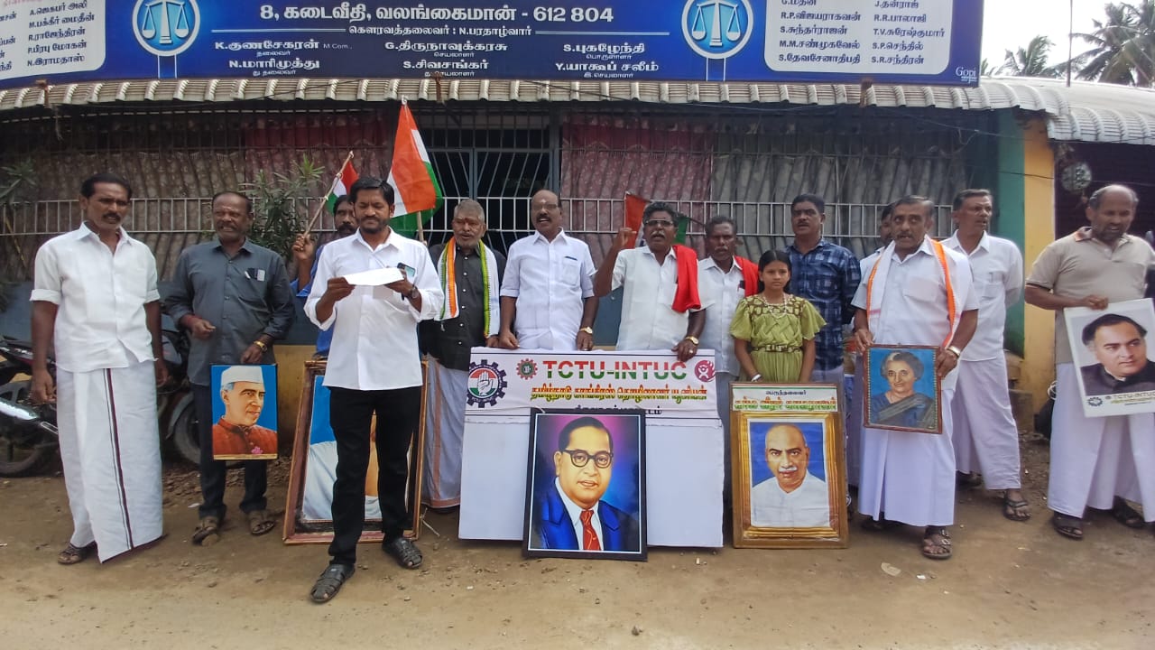 திருவாரூர் மாவட்டம் வலங்கைமான் கடைவீதி ராமர் கோவில் பேருந்து நிறுத்தம் அருகில், தமிழ்நாடு காங்கிரஸ் தொழிலாளர் யூனியன் சார்பாக உள்துறை அமைச்சர் அமித்ஷாவை கண்டித்து கண்டன ஆர்ப்பாட்டம் நடைபெற்றது.