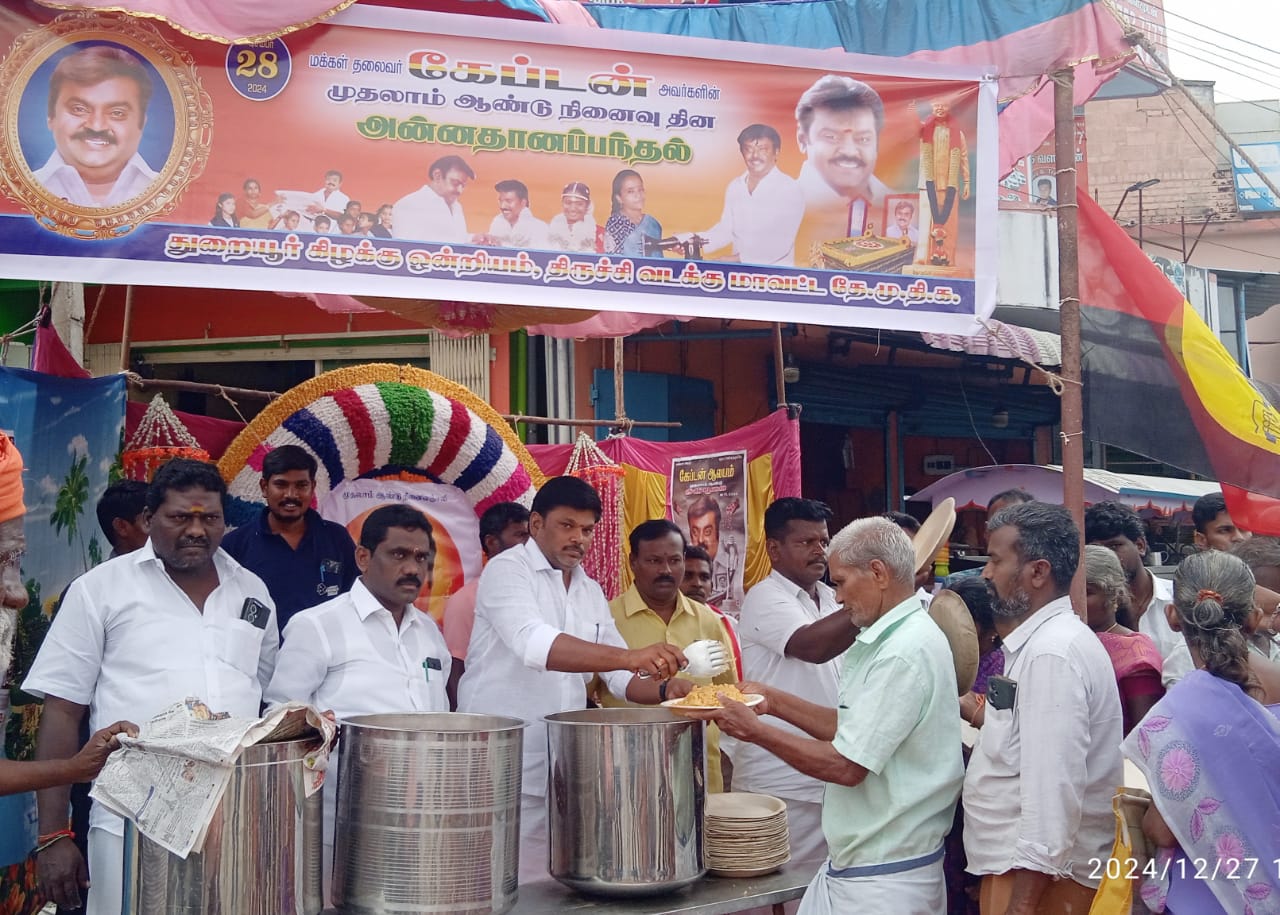 திருச்சி மாவட்டம் துறையூர் கிழக்கு ஒன்றிய தேமுதிக சார்பில் விஜயகாந்தின் முதலாம் ஆண்டு நினைவு தினத்தை முன்னிட்டு அன்னதானம் வழங்கப்பட்டது.