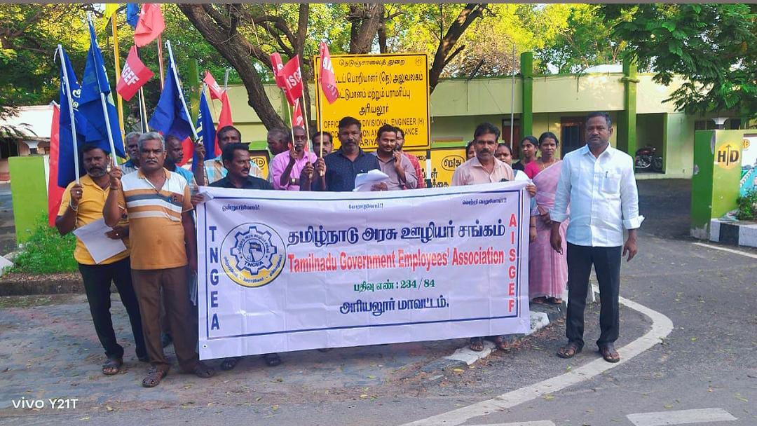 தமிழ்நாடு அரசு ஊழியர் சங்கத்தின் சார்பில், அரியலூர் நெடுஞ்சாலைத்துறை அலுவலகம் முன்பு ஆர்ப்பாட்டம் நடைபெற்றது. சங்கத்தின் மாவட்ட இணை செயலாளர் சிவக்குமார் தலைமை தாங்கி நடைபெற்ற இந்த ஆர்ப்பாட்டத்திற்கு, இணை செயலாளர் காந்தி, வட்ட செயலாளர் அம்பேத்கர் உள்ளிட்டோர் முன்னிலை வகித்தனர்.