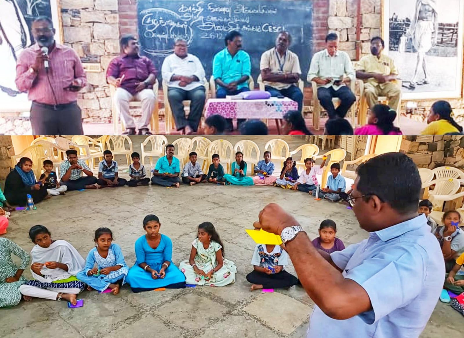 னார். ஒருகாமி பயிற்றுனர் அமல்ராஜ் குழந்தைகளுக்கு காகித பொம்மை கள் செய்ய கற்றுத் தந்தார்.