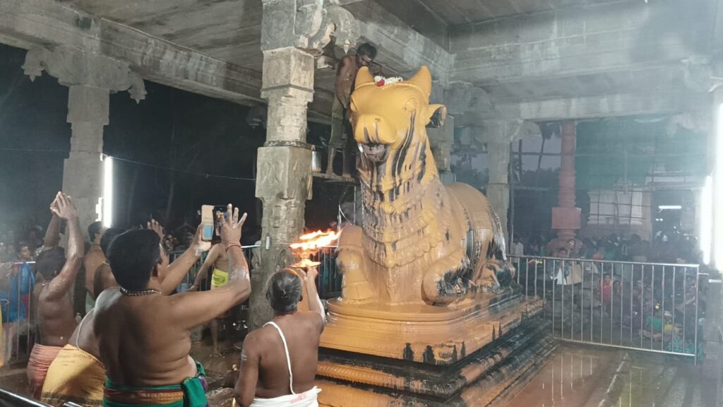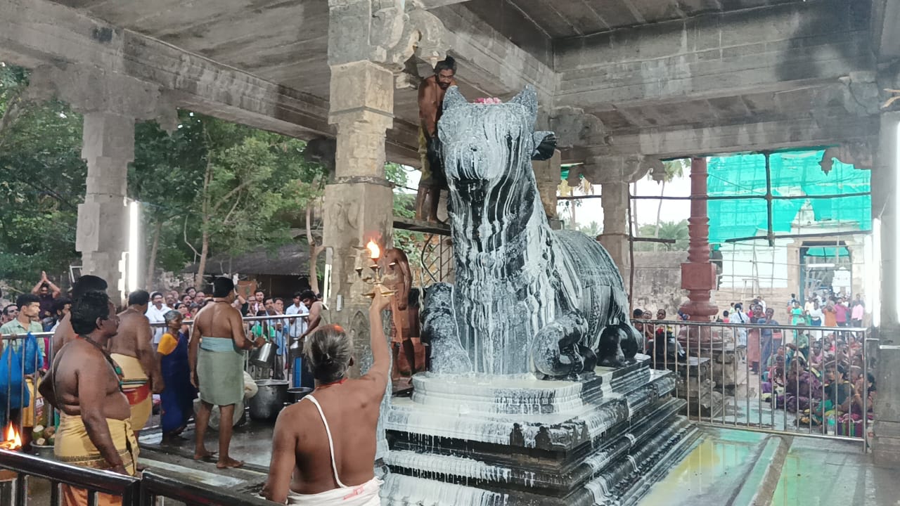 பிரதோஷத்தை முன்னிட்டு நந்தி பகவானுக்கு 1500 லிட்டர் பால், தயிர். சந்தனம். திரவிய பொடி. மஞ்சள் பொடி, விபூதி. தேன், இளநீர், பஞ்சாமிர்தம் உள்பட பல்வேறு வகையான அபிஷேக பொருட்களை சிவாச்சாரியர்கள் வேத மந்திரங்கள் முழங்க, ஓதுவார்கள் திருமுறை பாட சிறப்பு அபிஷேகம் செய்யப்பட்டது.